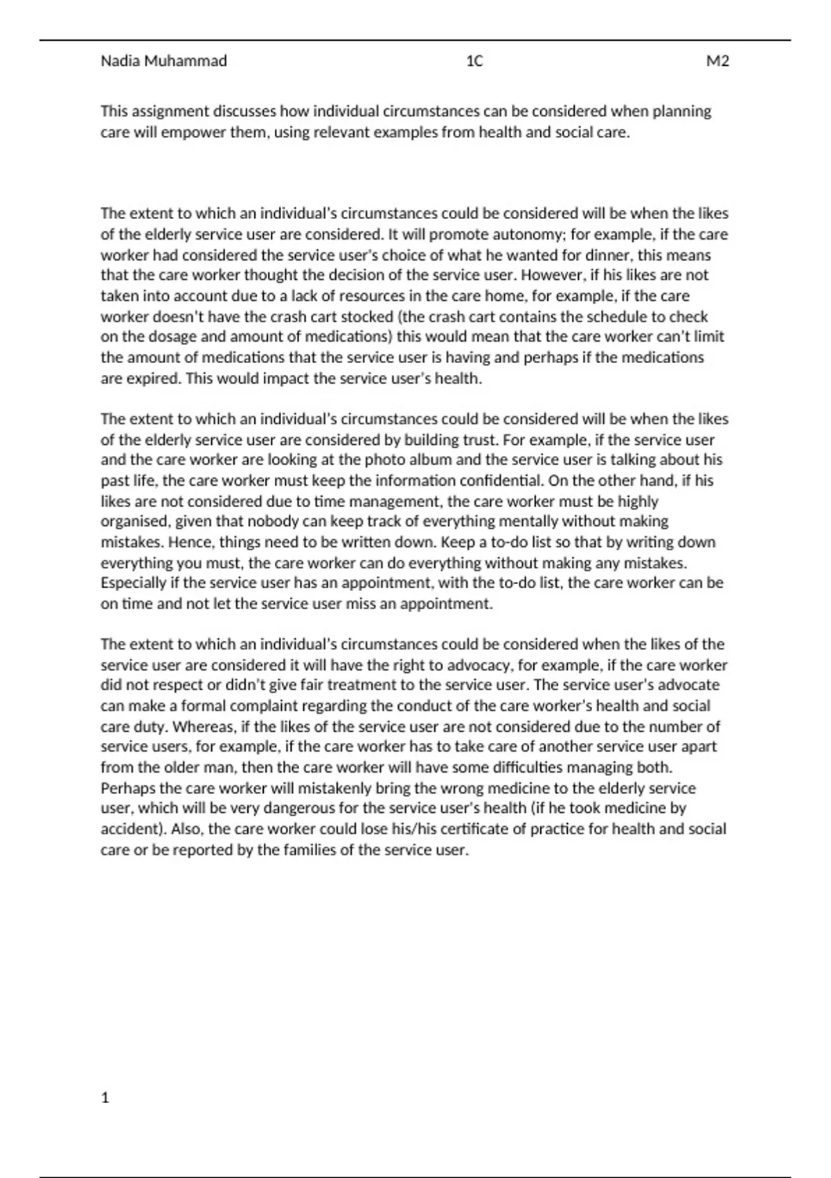 This is M2 of Learning Aim B: Investigate ways of empowering individuals who use health and social care services in Unit 2 - Health and Social Care Values. M2 - Discuss how individual circumstances can be considered when planning care that will empower them, using relevant examples from health and social care.