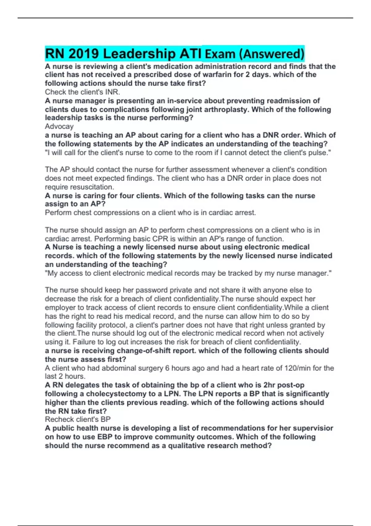 A nurse is reviewing a client's medication administration record and finds that the client has not received a prescribed dose of warfarin for 2 days. which of the following actions should the nurse take first? Check the client's INR. A nurse manager is presenting an in-service about preventing readmission of clients dues to complications following joint arthroplasty. Which of the following leadership tasks is the nurse performing? Advocay a nurse is teaching an AP about caring for a client who has a DNR order. Which of the following statements by the AP indicates an understanding of the teaching? "I will call for the client's nurse to come to the room if I cannot detect the client's pulse." The AP should contact the nurse for further assessment whenever a client's condition does not meet expected findings. The client who has a DNR order in place does not require resuscitation. A nurse is caring for four clients. Which of the following