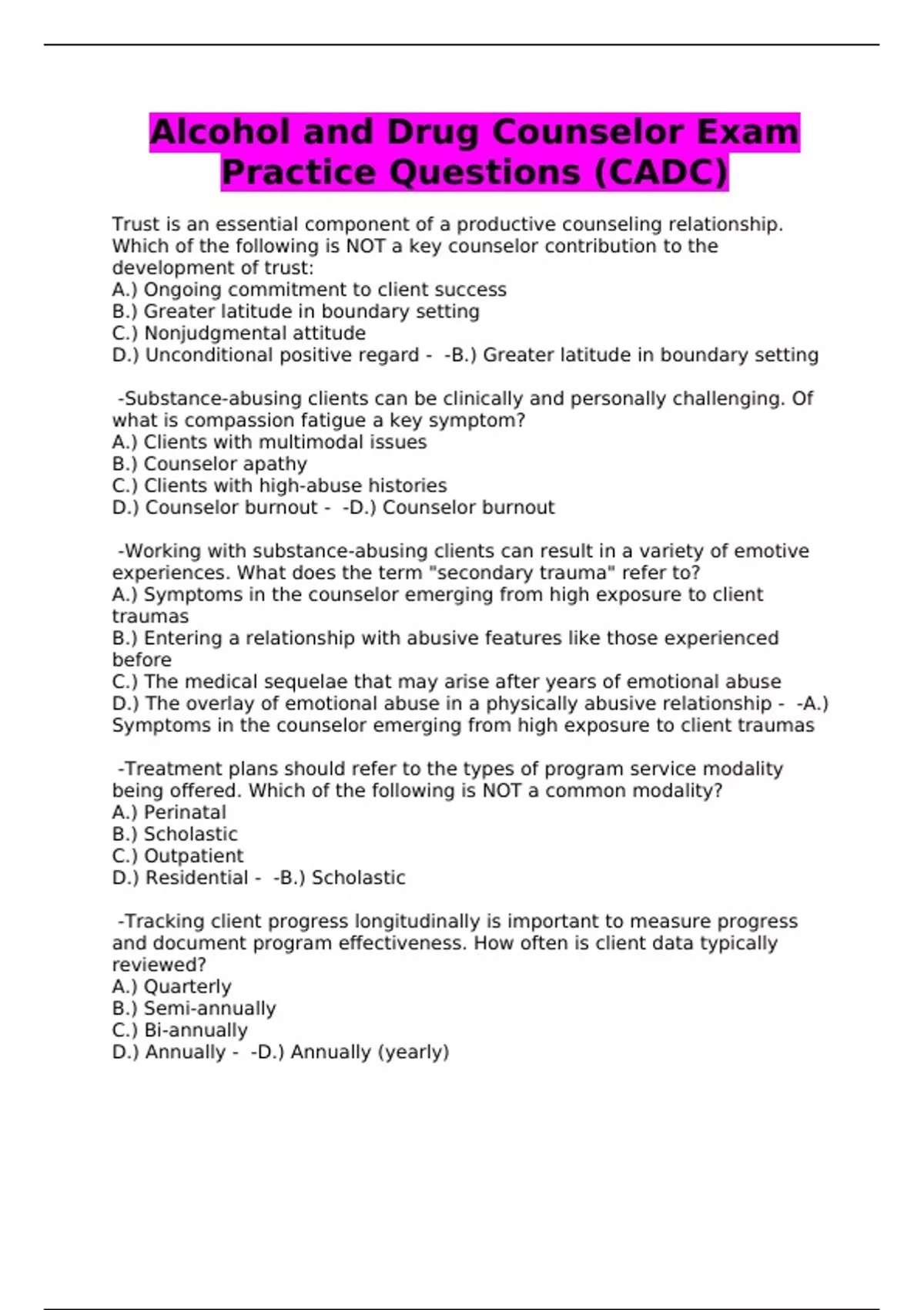 Alcohol and Drug Counselor Exam Practice Questions (CADC)
