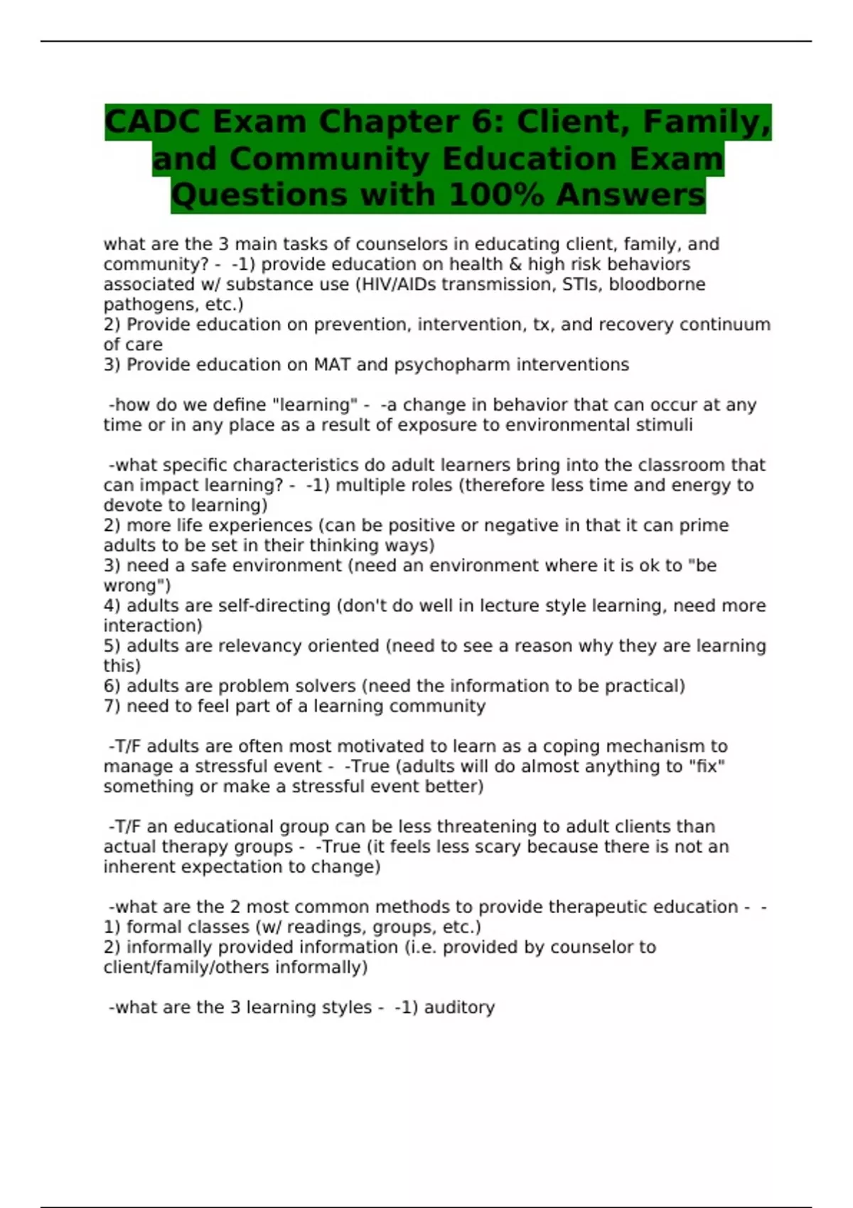 CADC Exam Chapter 6: Client, Family, and Community Education Exam Questions with 100% Answers