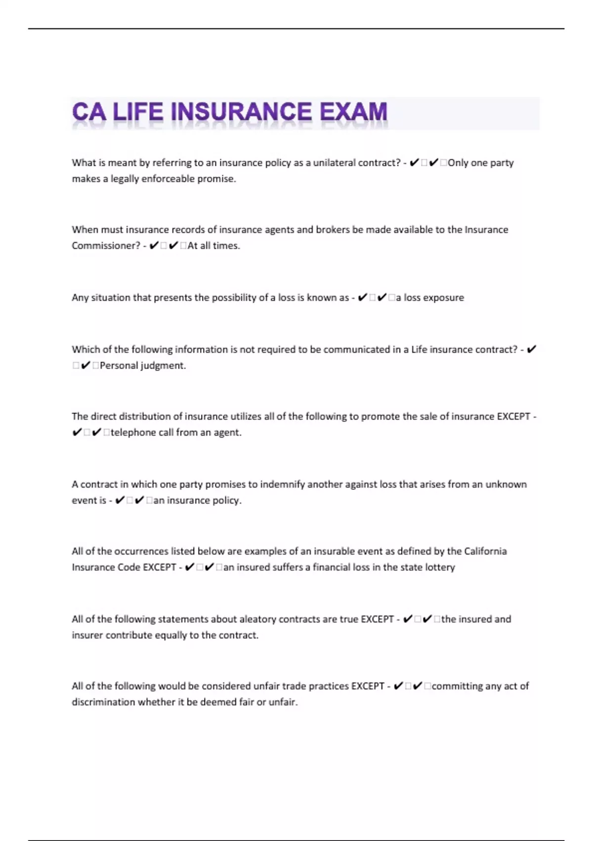 CA Life Insurance 164 Exam Questions And Answers
