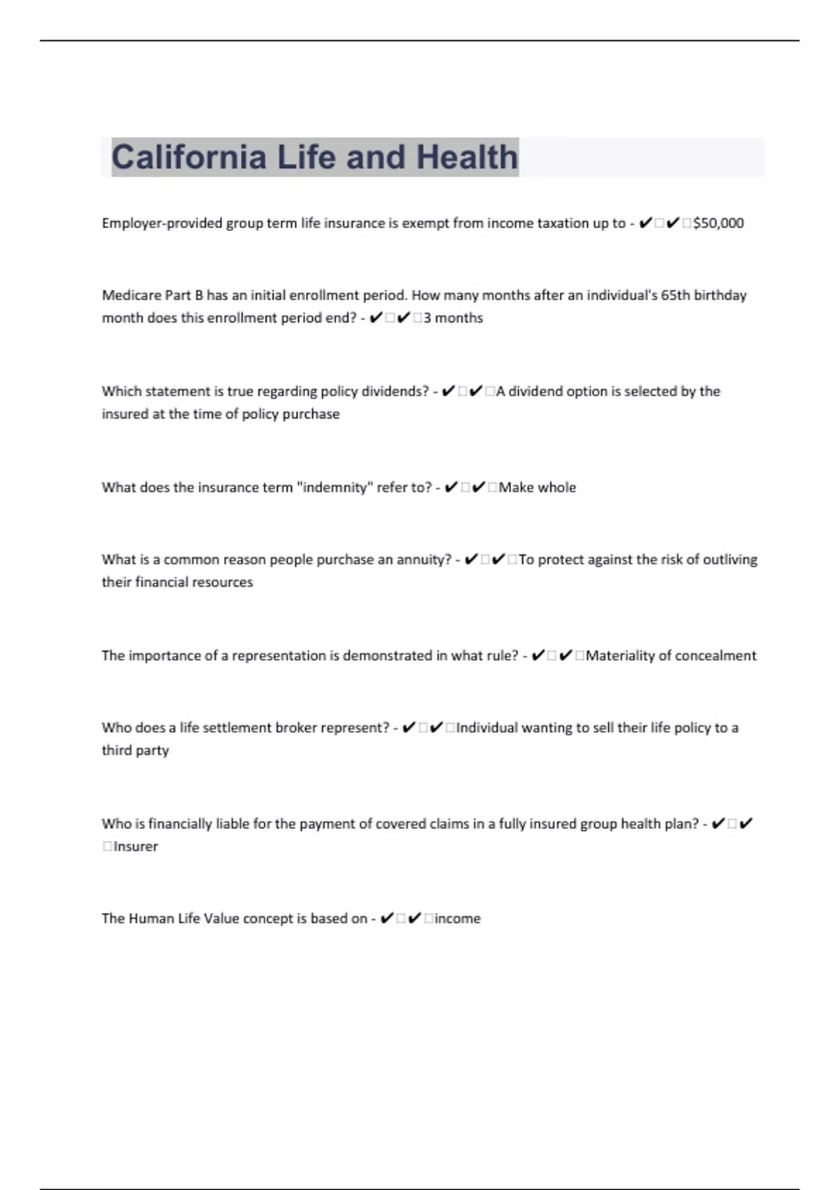 Employer-provided group term life insurance is exempt from income taxation up to - ️️$50,000 Medicare Part B has an initial enrollment period. How many months after an individual's 65th birthday month does this enrollment period end? - ️️3 months Which statement is true regarding policy dividends? - ️️A dividend option is selected by the insured at the time of policy purchase What does the insurance term "indemnity" refer to? - ️️Make whole What is a common reason people purchase an annuity? - ️️To protect against the risk of outliving their financial resources The importance of a representation is demonstrated in what rule? - ️️Materiality of concealment Who does a life settlement broker represent? - ️️Individual wanting to sell their life policy to a third party Who is financially liable for the payment of covered claims in a fully insured group health plan? - ️️Insurer The Human Life Value concept is based on - ️️income