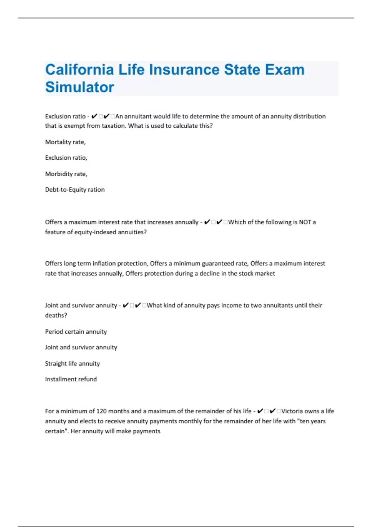Exclusion ratio - ️️An annuitant would life to determine the amount of an annuity distribution that is exempt from taxation. What is used to calculate this? Mortality rate, Exclusion ratio, Morbidity rate, Debt-to-Equity ration Offers a maximum interest rate that increases annually - ️️Which of the following is NOT a feature of equity-indexed annuities? Offers long term inflation protection, Offers a minimum guaranteed rate, Offers a maximum interest rate that increases annually, Offers protection during a decline in the stock market Joint and survivor annuity - ️️What kind of annuity pays income to two annuitants until their deaths? Period certain annuity Joint and survivor annuity Straight life annuity Installment refund For a minimum of 120 months and a maximum of the remainder of his life - ️️Victoria owns a life annuity and elects to receive annuity payments monthly for the remainder of her life with "ten years certain". Her annuity will make payments