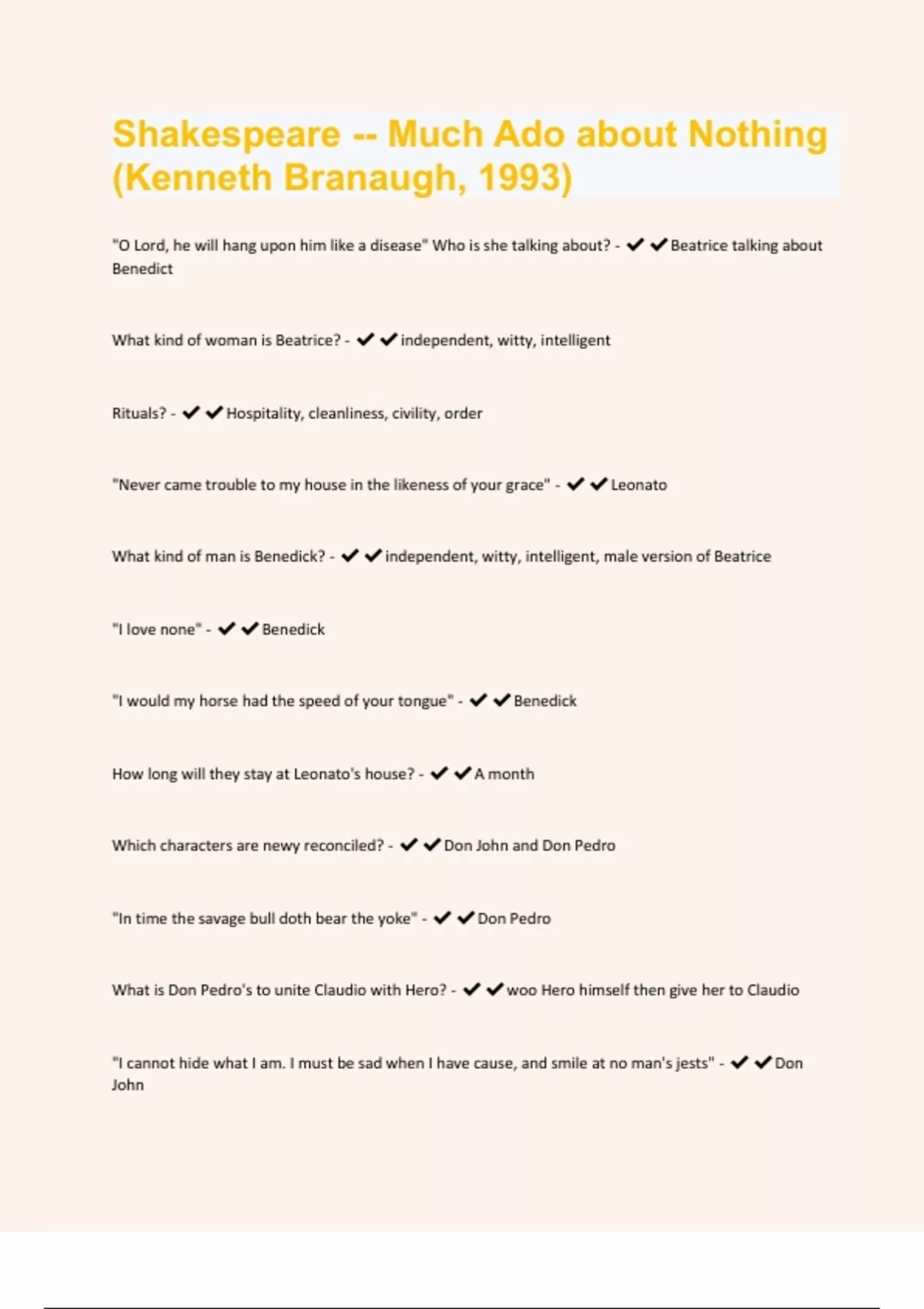 Shakespeare -- Much Ado about Nothing (Kenneth Branaugh, 1993) Questions and Answers with complete solutions