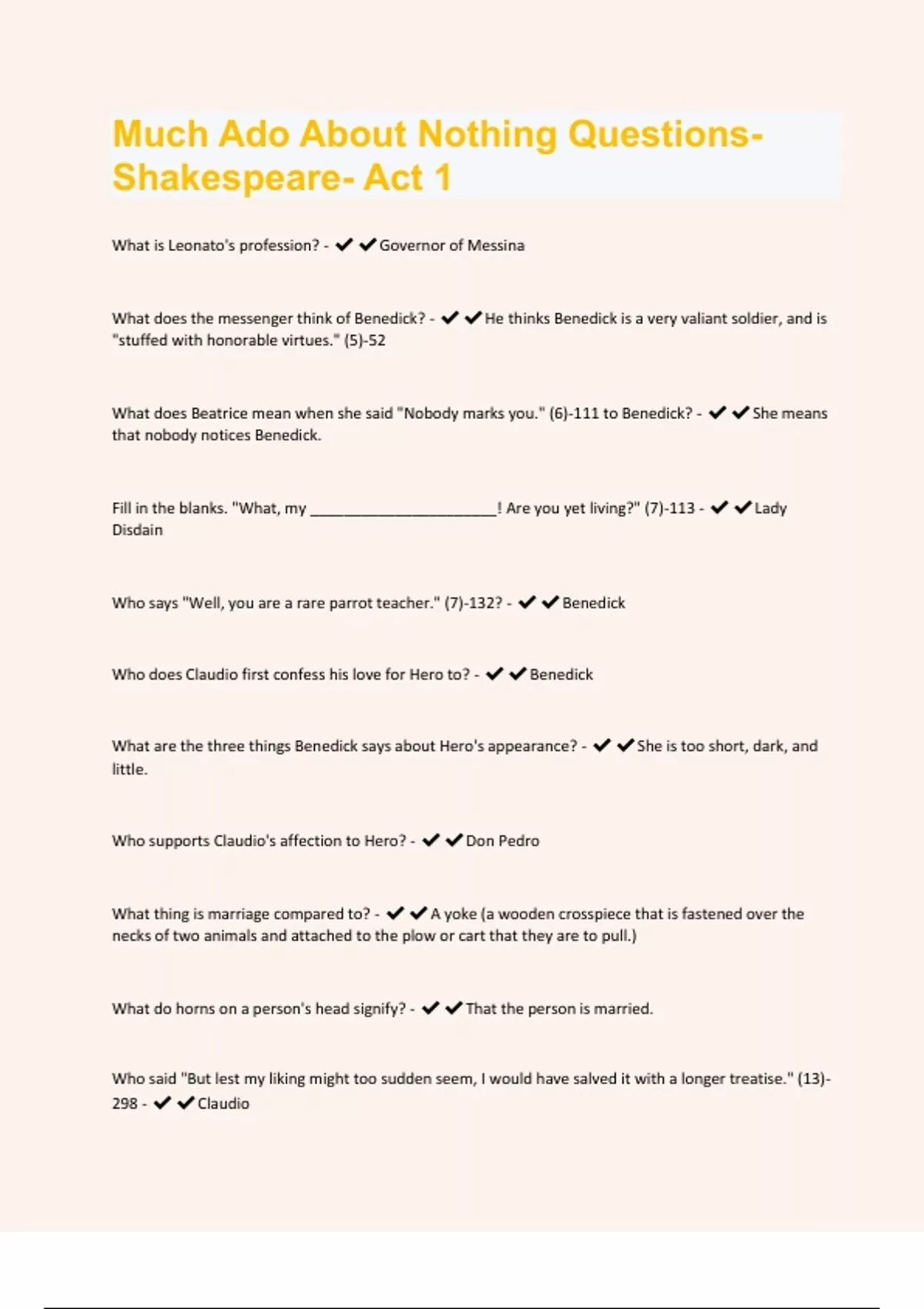 Much Ado About Nothing Questions- Shakespeare- Act 1 Graded A+(100% Verified)