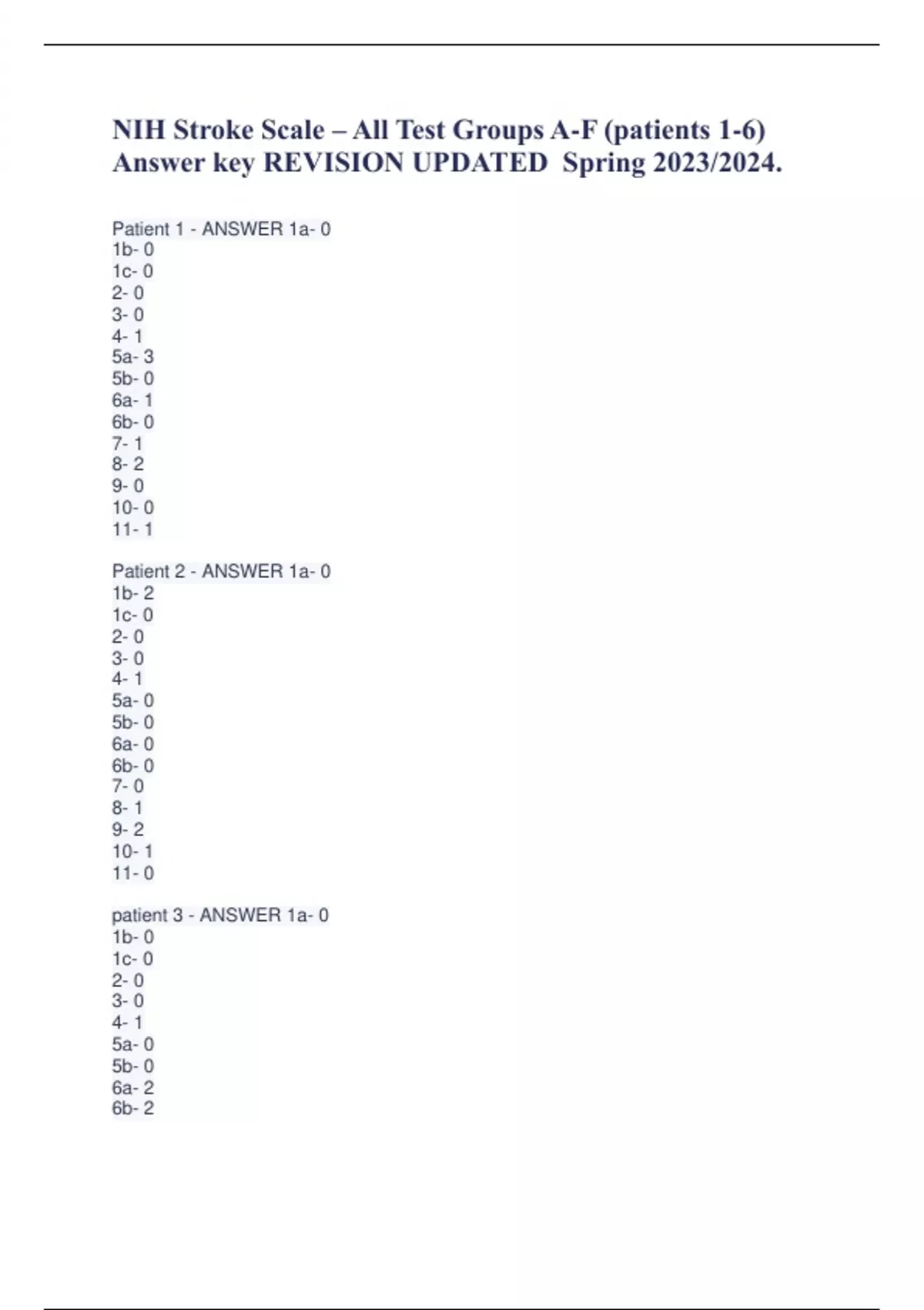 NIH Stroke Scale – All Test Groups A-F (patients 1-6) Answer key REVISION UPDATED Spring 2023/2024