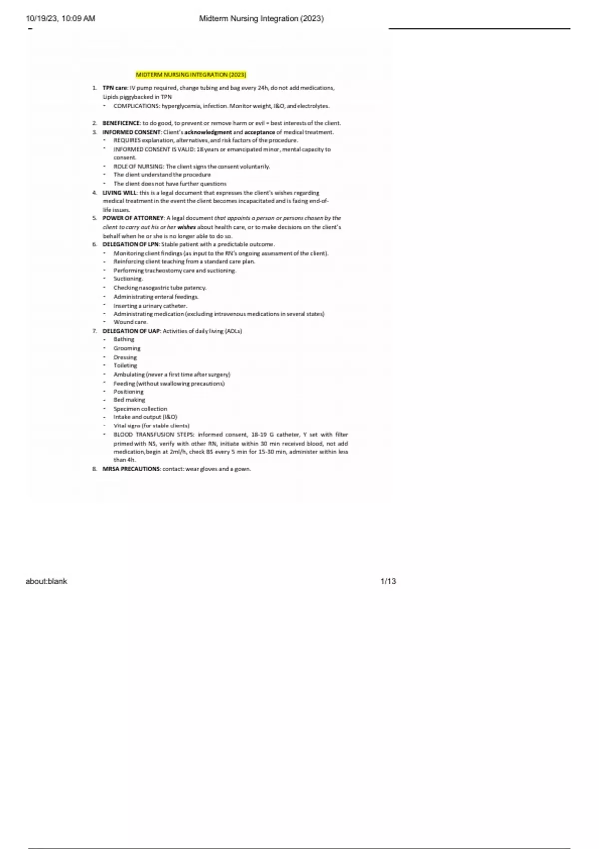 IDTERM NURSING INTEGRATION (2023) 1. TPN care: IV pump required, change tubing and bag every 24h, do not add medications, Lipids piggybacked in TPN • COMPLICATIONS: hyperglycemia, infection. Monitor weight, I&O, and electrolytes. 2. BENEFICENCE: to do good, to prevent or remove harm or evil = best interests of the client. 3. INFORMED CONSENT: Client’s acknowledgment and acceptance of medical treatment. • REQUIRES explanation, alternatives, and risk factors of the procedure. • INFORMED CONSENT IS VALID: 18 years or emancipated minor, mental capacity to consent. • ROLE OF NURSING: The client signs the consent voluntarily. • The client understand the procedure • The client does not have further questions 4. LIVING WILL: this is a legal document that expresses the client's wishes regarding medical treatment in the event the client becomes incapacitated and is facing end-of-life issues. 5. POWER OF ATTORNEY: A legal document that appoints a person or persons chosen by the client to carry out his or her wishes about health care, or to make decisions on the client’s behalf when he or she is no longer able to do so. 6. DELEGATION OF LPN: Stable patient with a predictable outcome. • Monitoring client findings (as input to the RN’s ongoing assessment of the client). • Reinforcing client teaching from a standard care plan. • Performing tracheostomy care and suctioning. • Suctioning. • Checking nasogastric tube patency. • Administrating enteral feedings. • Inserting a urinary catheter. • Administrating medication (excluding intravenous medications in several states) • Wound care. 7. DELEGATION OF UAP: Activities of daily living (ADLs