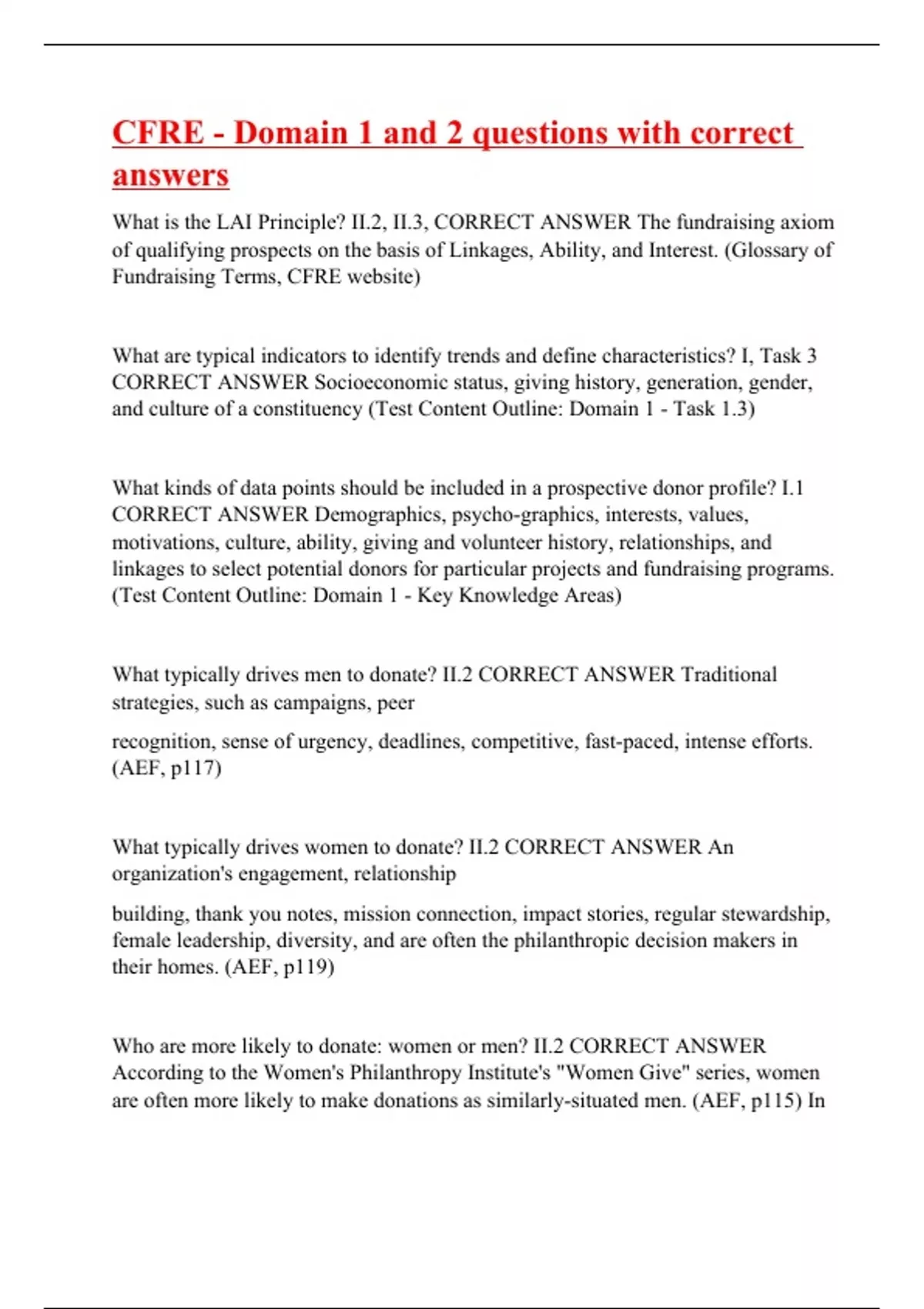 What is the LAI Principle? II.2, II.3, CORRECT ANSWER The fundraising axiom of qualifying prospects on the basis of Linkages, Ability, and Interest. (Glossary of Fundraising Terms, CFRE website) What are typical indicators to identify trends and define characteristics? I, Task 3 CORRECT ANSWER Socioeconomic status, giving history, generation, gender, and culture of a constituency (Test Content Outline: Domain 1 - Task 1.3) What kinds of data points should be included in a prospective donor profile? I.1 CORRECT ANSWER Demographics, psycho-graphics, interests, values, motivations, culture, ability, giving and volunteer history, relationships, and linkages to select potential donors for particular projects and fundraising programs. (Test Content Outline: Domain 1 - Key Knowledge Areas) What typically drives men to donate? II.2 CORRECT ANSWER Traditional strategies, such as campaigns, peer recognition, sense of urgency, deadlines, competitive, fast-paced, intense efforts. (AEF, p117) What typically drives women to donate? II.2 CORRECT ANSWER An organization's engagement, relationship building, thank you notes, mission connection, impact stories, regular stewardship, female leadership, diversity, and are often the philanthropic decision makers in their homes. (AEF, p119) Who are more likely to donate: women or men? II.2 CORRECT ANSWER According to the Women's Phi