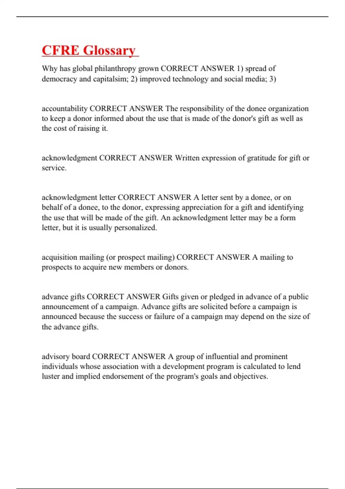 Why has global philanthropy grown CORRECT ANSWER 1) spread of democracy and capitalsim; 2) improved technology and social media; 3) accountability CORRECT ANSWER The responsibility of the donee organization to keep a donor informed about the use that is made of the donor's gift as well as the cost of raising it. acknowledgment CORRECT ANSWER Written expression of gratitude for gift or service. acknowledgment letter CORRECT ANSWER A letter sent by a donee, or on behalf of a donee, to the donor, expressing appreciation for a gift and identifying the use that will be made of the gift. An acknowledgment letter may be a form letter, but it is usually personalized. acquisition mailing (or prospect mailing) CORRECT ANSWER A mailing to prospects to acquire new members or donors. advance gifts CORRECT ANSWER Gifts given or pledged in advance of a public announcement of a campaign. Advance gifts are solicited before a campaign is announced because the success or failure of a campaign may depend on the size of the advance gifts. advisory board CORRECT ANSWER A group of influential and prominent individuals whose association with a development program is calculated to lend luster and implied endorsement of the program's goals and objectives.