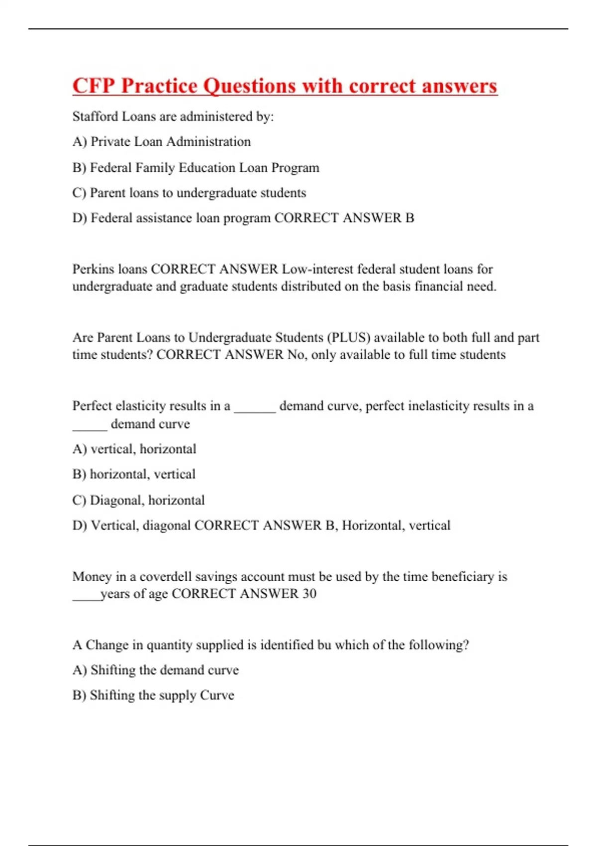 Stafford Loans are administered by: A) Private Loan Administration B) Federal Family Education Loan Program C) Parent loans to undergraduate students D) Federal assistance loan program CORRECT ANSWER B Perkins loans CORRECT ANSWER Low-interest federal student loans for undergraduate and graduate students distributed on the basis financial need. Are Parent Loans to Undergraduate Students (PLUS) available to both full and part time students? CORRECT ANSWER No, only available to full time students Perfect elasticity results in a ______ demand curve, perfect inelasticity results in a _____ demand curve A) vertical, horizontal B) horizontal, vertical C) Diagonal, horizontal D) Vertical, diagonal CORRECT ANSWER B, Horizontal, vertical Money in a coverdell savings account must be used by the time beneficiary is ____years of age CORRECT ANSWER 30 A Change in quantity supplied
