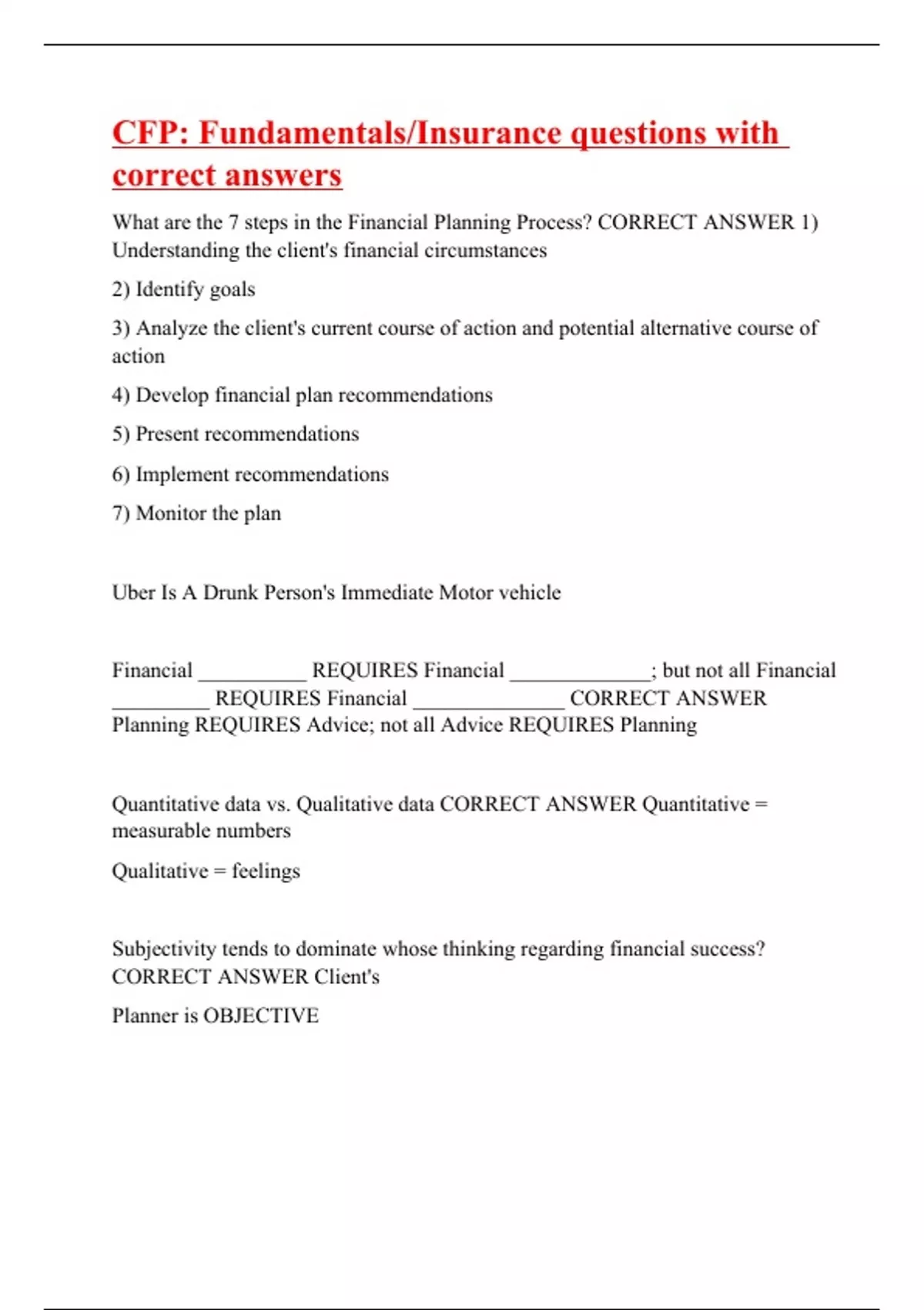 What are the 7 steps in the Financial Planning Process? CORRECT ANSWER 1) Understanding the client's financial circumstances 2) Identify goals 3) Analyze the client's current course of action and potential alternative course of action 4) Develop financial plan recommendations 5) Present recommendations 6) Implement recommendations 7) Monitor the plan Uber Is A Drunk Person's Immediate Motor vehicle Financial __________ REQUIRES Financial _____________; but not all Financial _________ REQUIRES Financial ______________ CORRECT ANSWER Planning REQUIRES Advice; not all Advice REQUIRES Planning Quantitative data vs. Qualitative data CORRECT ANSWER Quantitative = measurable numbers Qualitative = feelings