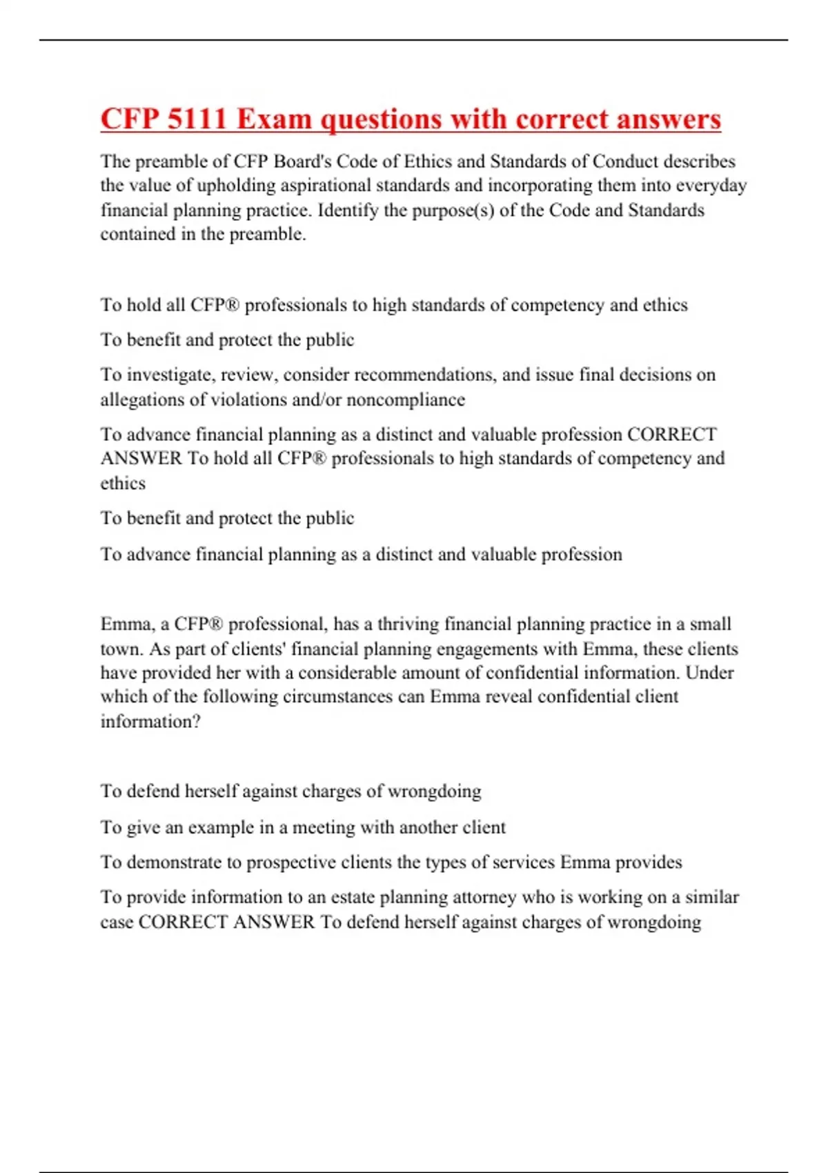 The preamble of CFP Board's Code of Ethics and Standards of Conduct describes the value of upholding aspirational standards and incorporating them into everyday financial planning practice. Identify the purpose(s) of the Code and Standards contained in the preamble. To hold all CFP® professionals to high standards of competency and ethics To benefit and protect the public To investigate, review, consider recommendations, and issue final decisions on allegations of violations and/or noncompliance To advance financial planning as a distinct and valuable profession CORRECT ANSWER To hold all CFP® professionals to high standards of competency and ethics To benefit and protect the public To advance financial planning as a distinct and valuable profession Emma, a CFP® professional, has a thriving financial planning practice in a small town. As part of clients' financial planning engagements with Emma, these clients have provided her with a considerable amount of confidential information. Under which of the following circumstances can Emma reveal confidential client information? To defend herself against charges of wrongdoing To give an example in a meeting with another client To demonstrate to prospective clients the types of services Emma provides To provide information to an estate planning attorney who is working on a similar case CORRECT ANSWER To d