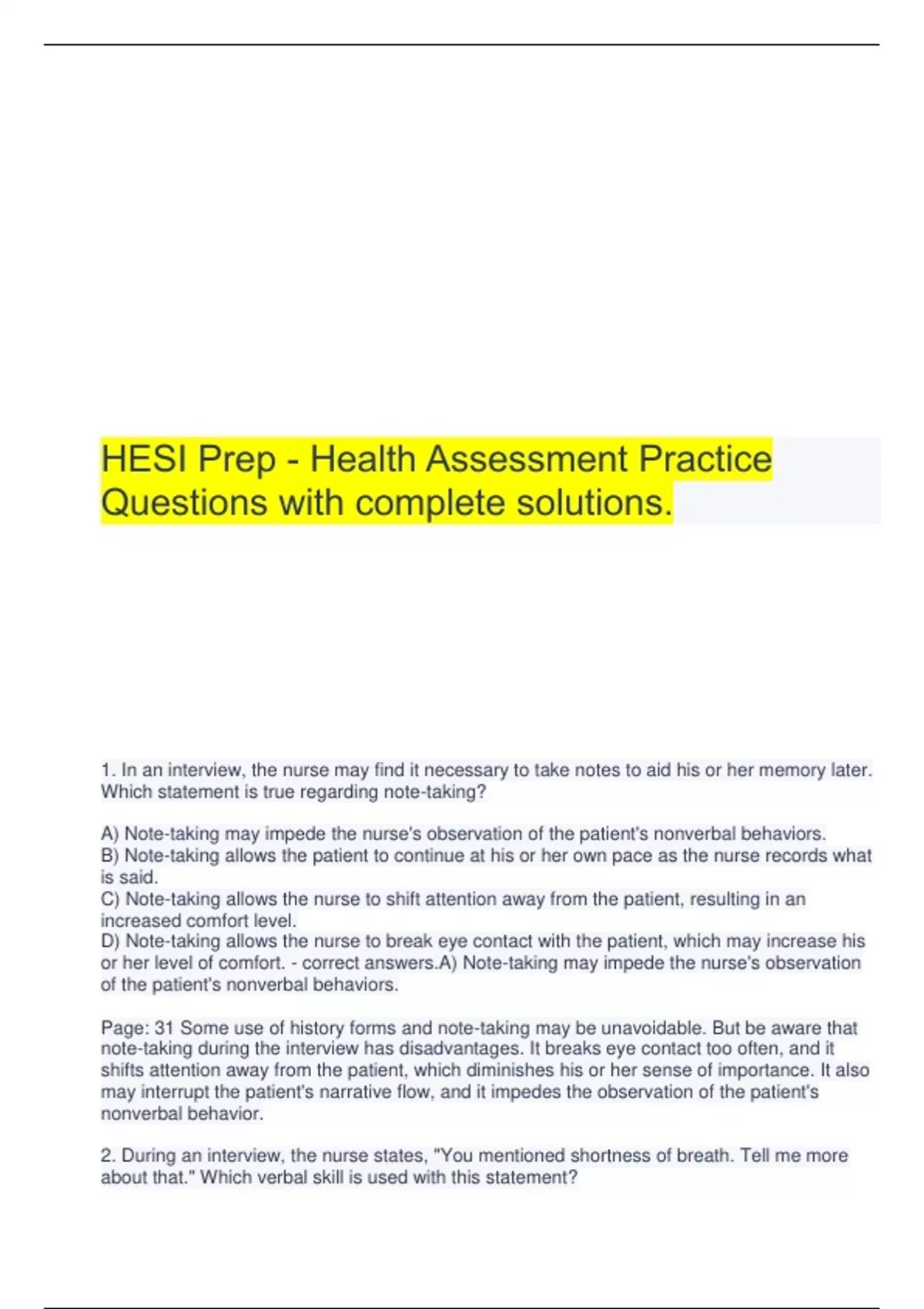 HESI Prep - Health Assessment Practice Questions with complete solutions. 1. In an interview, the nurse may find it necessary to take notes to aid his or her memory later. Which statement is true regarding note-taking? A) Note-taking may impede the nurse's observation of the patient's nonverbal behaviors. B) Note-taking allows the patient to continue at his or her own pace as the nurse records what is said. C) Note-taking allows the nurse to shift attention away from the patient, resulting in an increased comfort level. D) Note-taking allows the nurse to break eye contact with the patient, which may increase his or her level of comfort. - correct answers.A) Note-taking may impede the nurse's observation of the patient's nonverbal behaviors. Page: 31 Some use of history forms and note-taking may be unavoidable. But be aware that note-taking during the interview has disadvantages. It breaks eye contact too often, and it shifts attention away from the patient, which diminishes his or her sense of importance. It also may interrupt the patient's narrative flow, and it impedes the observation of the patient's nonverbal behavior. 2. During an interview, the nurse states, "You mentioned shortness of breath. Tell me more about that." Which verbal skill is used with this statement? A) Reflection B) Facilitation C) Direct question D) Open-ended question - correct answers.D) Open-ended question Page: 32 The open-ended question asks for narrative information. It states the topic to be discussed but only in general terms. The nurse should use it to begin the interview, to introduce a new section of questions, and whenever the person introduces a new topic. 3. A nurse is taking complete health histories on all of the patients attending a wellness workshop. On the history form, one of the written questions asks, "You don't smoke, drink, or take drugs, do you?" This question is an example of: A) talking too much. B) using confrontation. C) using biased or leading questions. D) using blunt language to deal with distasteful topics. - correct answers.C) using biased or leading questions. Page: 36 This is an example of using leading or biased questions. Asking, "You don't smoke, do you?" implies that one answer is "better" than another. If the person wants to please someone, he or she is either forced to answer in a way corresponding to their implied values or is made to feel guilty when admitting the other answer. 4. During an interview, a parent of a hospitalized child is sitting in an open position. As the interviewer begins to discuss his son's treatment, however, he suddenly crosses his arms against his chest and crosses his legs. This would suggest that the parent is: A) just changing positions. B) more comfortable in this position. C) tired and needs a break from the interview. D) uncomfortable talking about his son's treatment. - correct answers.D) uncomfortable talking about his son's treatment. Page: 37 Note the person's position. An open position with the extension of large muscle groups shows relaxation, physical comfort, and a willingness to share information. A closed position with the arms and legs crossed tends to look defensive and anxious. Note any change in posture. If a person in a relaxed position suddenly tenses, it suggests possible discomfort with the new topic. 5. The nurse is interviewing a patient who has a hearing impairment. What techniques would be most beneficial in communicating with this patient? A) Determine the communication method he prefers. B) Avoid using facial and hand gestures because most hearing-impaired people find this degrading. C) Request a sign language interpreter before meeting with him to help facilitate the communication. D) Speak loudly and with exaggerated facial movement when talking with him because this helps with lip reading. - correct answers.A) Determine the communication method he prefers. Pages: 40-41 The nurse should ask the deaf person the preferred way to communicate—by signing, lip reading, or writing. If the person prefers lip reading, then the nurse should be sure to face him or her squarely and have good lighting on the nurse's face. The nurse should not exaggerate lip movements because this distorts words. Similarly, shouting distorts the reception of a hearing aid the person may wear. The nurse should speak slowly and should supplement his or her voice with appropriate hand gestures or pantomime. 6. The nurse is performing a health interview on a patient who has a language barrier, and no interpreter is available. Which is the best example of an appropriate question for the nurse to ask in this situation? A) "Do you take medicine?" B) "Do you sterilize the bottles?" C) "Do you have nausea and vomiting?" D) "You have been taking your medicine, haven't you?" - correct answers.A) "Do you take medicine?" Page: 46 In a situation where there is a language barrier and no interpreter available, use simple words avoiding medical jargon. Avoid using contractions and pronouns. Use nouns repeatedly and discuss one topic at a time. 7. A female patient does not speak English well, and the nurse needs to choose an interpreter. Which of the following would be the most appropriate choice? A) A trained interpreter B) A male family member C) A female family member D) A volunteer college student from the foreign language studies department - correct answers.A) A trained interpreter Page: 46 whenever possible, the nurse should use a trained interpreter, preferably one who knows medical terminology. In general, an older, more mature interpreter is preferred to a younger, less experienced one, and the same gender is preferred when possible. 8. The nurse is conducting an interview. Which of these statements is true regarding open-ended questions? Select all that apply. A) They elicit cold facts. B) They allow for self-expression. C) They build and enhance rapport. D) They leave interactions neutral. E) They call for short one- to two-word answers. F) They are 