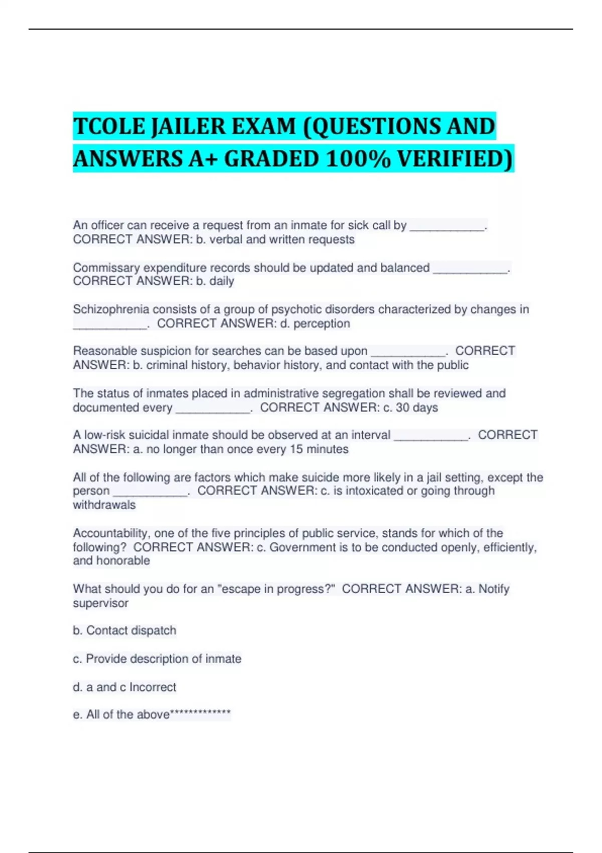 TCOLE JAILER EXAM (QUESTIONS AND ANSWERS A+ GRADED 100% VERIFIED) An officer can receive a request from an inmate for sick call by ___________. CORRECT ANSWER: b. verbal and written requests Commissary expenditure records should be updated and balanced ___________. CORRECT ANSWER: b. daily Schizophrenia consists of a group of psychotic disorders characterized by changes in ___________. CORRECT ANSWER: d. perception Reasonable suspicion for searches can be based upon ___________. CORRECT ANSWER: b. criminal history, behavior history, and contact with the public The status of inmates placed in administrative segregation shall be reviewed and documented every ___________. CORRECT ANSWER: c. 30 days A low-risk suicidal inmate should be observed at an interval ___________. CORRECT ANSWER: a. no longer than once every 15 minutes All of the following are factors which make suicide more likely in a jail setting, except the person ___________. CORRECT ANSWER: c. is intoxicated or going through withdrawals Accountability, one of the five principles of public service, stands for which of the following? CORRECT ANSWER: c. Government is to be conducted openly, efficiently, and honorable What should you do for an "escape in progress?" CORRECT ANSWER: a. Notify supervisor b. Contact dispatch c. Provide description of inmate d. a and c Incorrect e. All of the above************* When transporting inmates from other agencies, what is a different step in the procedure? CORRECT ANSWER: b. Use precautions All of the following are negligent, malicious acts done intentionally by jail personnel, leading to tort liability, except ___________. CORRECT ANSWER: a. minimum use of force The principal focus of ethics is moral problems, as opposed to the formation of habits of good character. CORRECT ANSWER: False A custody reassessment or review is necessary to allow for changes over time in inmates' legal status, disciplinary actions, ___________, or other circumstances. CORRECT ANSWER: a. appeals The ___________ jail design has more physical barriers than the direct supervision design. CORRECT ANSWER: d. intermittent Of the 5 types of Hepatitis, which is the most widespread? CORRECT ANSWER: b. B Jail health care workers should treat all offenders as ___________. CORRECT ANSWER: b. potentially infected with HIV A person is entitled to a/an ___________ when they meet your facility requirements for being unable to provide themselves with specific personal care items. CORRECT ANSWER: a. indigent pack When transporting inmates with mental illness the patient my NOT be transported in a ________ or accompanied by a(n) ________ unless other means are not available. CORRECT ANSWER: b. marked police or sheriff's car/uniformed officer This term has to do with the right of an inmate to be brought before a court or judge to determine the legality of his imprisonment. CORRECT ANSWER: c. habeas corpus A ___________ is an order signed by a magistrate directing a sheriff to receive and place in jail a person so committed. CORRECT ANSWER: b. commitment Officers can refer to ________ for requirements for bail. CORRECT ANSWER: c. CCP When documenting the type of release at the time an inmate leaves the facility, it is important to record all of the following except ___________. CORRECT ANSWER: d. future risk assessment If a public servant, under color of law of the office, intentionally subjects another to mistreatment, what offense is committed? CORRECT ANSWER: c. Official Oppression After escorting an inmate to court, the inmate should be restrained while in the courtroom, unless ___________. CORRECT ANSWER: a. the inmate is before the bench b. the inmate is sitting at the defense table c. the inmate is standing before the bench if judge prefers no restraints d. all of the above********* e. none of the above, inmate needs to be restrained at all times Incorrect Vehicles entering or leaving a secure area of a jail facility should be searched. All of the following should be documented except ___________. CORRECT ANSWER: b. tools used to conduct search General consideration(s) in handling evidence is/are to ___________. CORRECT ANSWER: a. preserve its integrity b. preserve its value to the owner c. mark it as evidence d. a and c Incorrect e. all of the above******* The facility's fire prevention plan should be evaluated ___________ and the facility inspected ___________. CORRECT ANSWER: b. quarterly/annually If the inmate refuses to sign a property receipt, what should the officer do? CORRECT ANSWER: c. have another officer witness the refusal and sign the receipt Which of the following is NOT a required daily documentation regarding the number of inmates in the facility? CORRECT ANSWER: b. names of all inmates discharged during the last week Many communicable diseases are much more common within the confines of the jail than outside the jails. CORRECT ANSWER: True If a person dies in custody, the sheriff has ______ to make a report to the attorney general. CORRECT ANSWER: c. 30 days