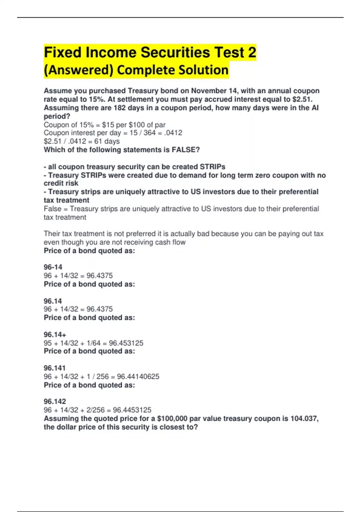 Assume you purchased Treasury bond on November 14, with an annual coupon rate equal to 15%. At settlement you must pay accrued interest equal to $2.51. Assuming there are 182 days in a coupon period, how many days were in the AI period? Coupon of 15% = $15 per $100 of par Coupon interest per day = 15 / 364 = .0412 $2.51 / .0412 = 61 days Which of the following statements is FALSE? - all coupon treasury security can be created STRIPs - Treasury STRIPs were created due to demand for long term zero coupon with no credit risk - Treasury strips are uniquely attractive to US investors due to their preferential tax treatment False = Treasury strips are uniquely attractive to US investors due to their preferential tax treatment