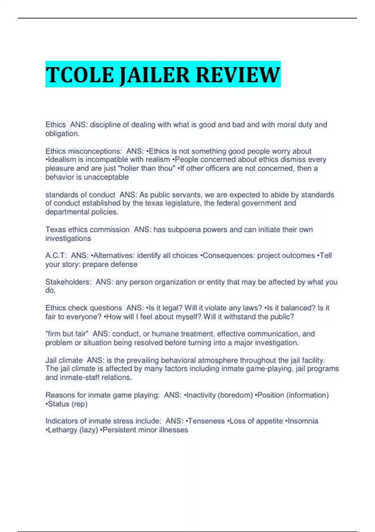 TCOLE JAILER REVIEW Ethics ANS: discipline of dealing with what is good and bad and with moral duty and obligation. Ethics misconceptions: ANS: •Ethics is not something good people worry about •Idealism is incompatible with realism •People concerned about ethics dismiss every pleasure and are just "holier than thou" •If other officers are not concerned, then a behavior is unacceptable standards of conduct ANS: As public servants, we are expected to abide by standards of conduct established by the texas legislature, the federal government and departmental policies. Texas ethics commission ANS: has subpoena powers and can initiate their own investigations A.C.T: ANS: •Alternatives: identify all choices •Consequences: project outcomes •Tell your story: prepare defense Stakeholders: ANS: any person organization or entity that may be affected by what you do. Ethics check questions ANS: •Is it legal? Will it violate any laws? •Is it balanced? Is it fair to everyone? •How will I feel about myself? Will it withstand the public? "firm but fair" ANS: conduct, or humane treatment, effective communication, and problem or situation being resolved before turning into a major investigation. Jail climate ANS: is the prevailing behavioral atmosphere throughout the jail facility. The jail climate is affected by many factors including inmate game-playing, jail programs and inmate-staff relations. Reasons for inmate game playing: ANS: •Inactivity (boredom) •Position (information) •Status (rep) Indicators of inmate stress include: ANS: •Tenseness •Loss of appetite •Insomnia •Lethargy (lazy) •Persistent minor illnesses Three components of communication: ANS: •Verbal communication ("what I say") •Body language (How I show it) •Listening (the effect of the words selected) Attitude ANS: combo of personal knowledge and feelings about someone or something that influence behavior Race ANS: refers to groups of people with certain ancestry and shared characteristics Ethnicity ANS: refers to shared culture and background Ethnocentrism ANS: ones culture as the center and the basis for all comparisons Prejudice ANS: judgment formed beforehand Discrimination ANS: acting on the basis of prejudice Basic beliefs or attitudes harbored by prejudiced people: ANS: •Feeling of superiority •Others are strange or different •Proprietary claims •Fear Forms of prejudice: ANS: •Racial •Ethnic •Gender •National origin •Political affiliation •Authority figures •Sexual orientation •Physically/mentally challenged •Religious •Age •Economic/occupational/socioeconomic status •Weight •Individual personal preferences All people share common needs: ANS: social, health, employment, shelter, food and self image Individuals should be evaluated on their ANS: merit Display to avoid prejudice: ANS: •Sensitivity •Impartiality •Empathy •Tolerance U.S Code 241: ANS: Conspiracy against rights: 2 or more conspire to deny right, $10k fine, term of imprisonment not to exceed 10 years or if a death occurred, life sentence. U.S Code 242: ANS: Deprivation of rights under color of law. Any person found to deny right, privilege or immunities found in constitution is subject to fine, imprisonment or both. Quid pro quo ANS: sexual act is precedent before a benefit Hostile work environment ANS: occurs when the conduct impedes performance USCA 1983: ANS: DON'T IMPEDE ON RIGHTS OF OTHERS Equal employment opportunity commission ANS: investigate sexual harassment allegations stress can cause ANS: impaired health, burnout, early retirement, and impaired family life/process the body undergoes when exposed to outside stimulus, in which the body's reaction is fight or flight Hans Selye ANS: the pioneer in stress research. Critical incident stress (CID) ANS: extraordinary occupational events that can cause exceptionally strong emotional reactions. Acute Stress Disorder (ASD) ANS: person has been exposed to a traumatic event in which both of the following were present: death, horror Individual has symptoms that last a minimum of 2 days and maximum of 4 weeks and occurs within 4 weeks of the incident.