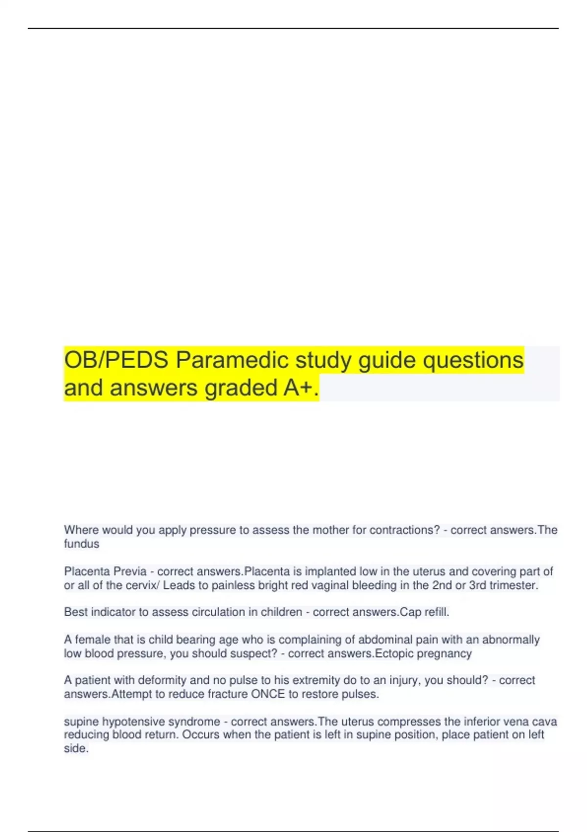 OB/PEDS Paramedic study guide questions and answers graded A+.