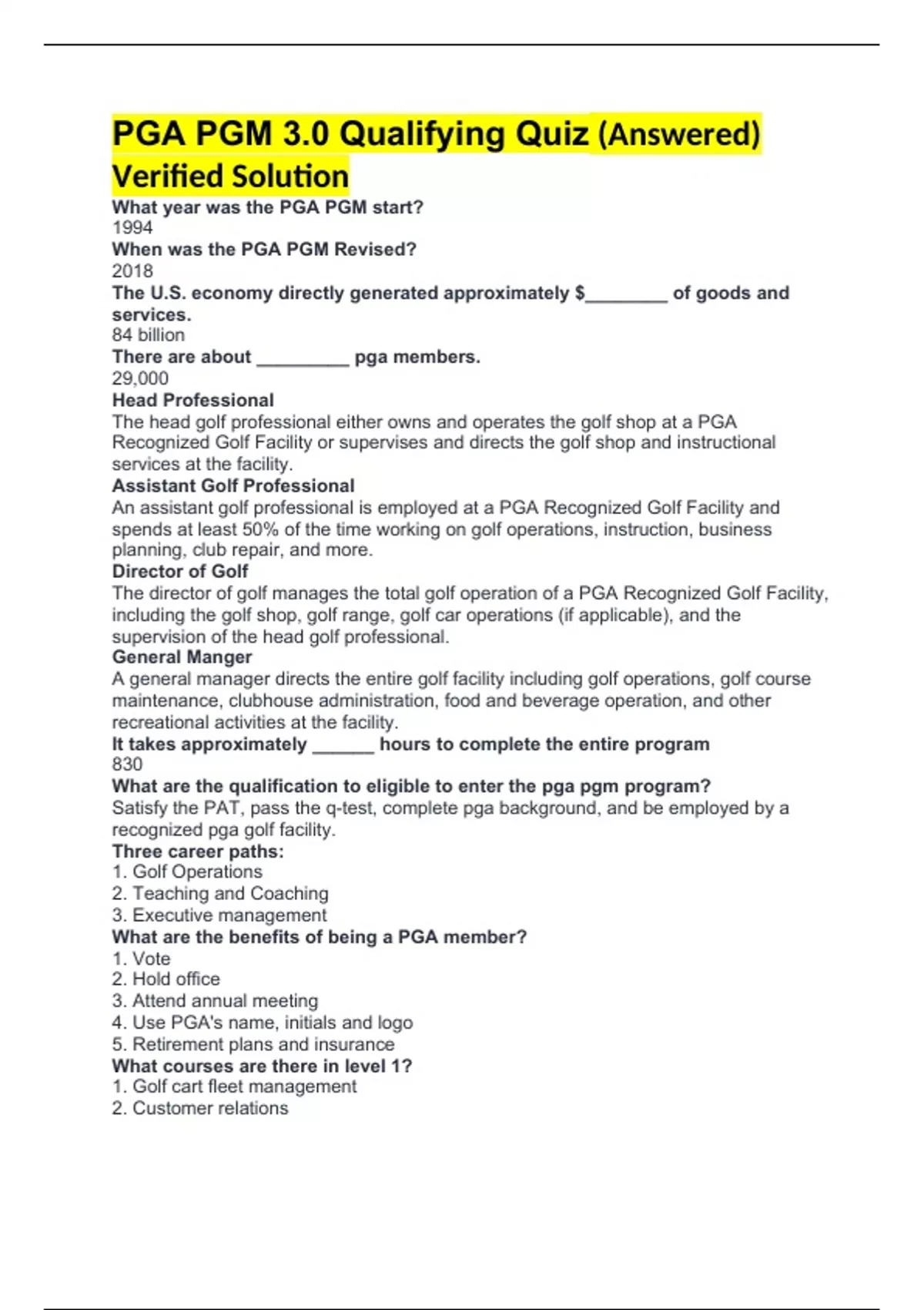 PGA PGM 3.0 Qualifying Quiz (Answered) Verified Solution