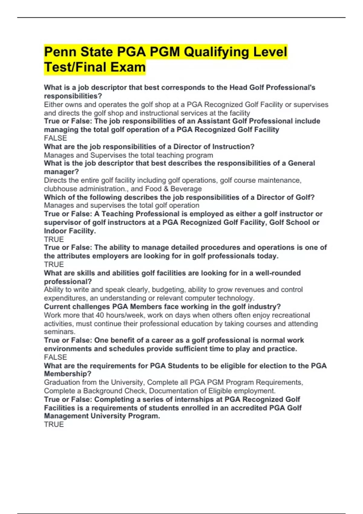 Penn State PGA PGM Qualifying Level Test/Final Exam