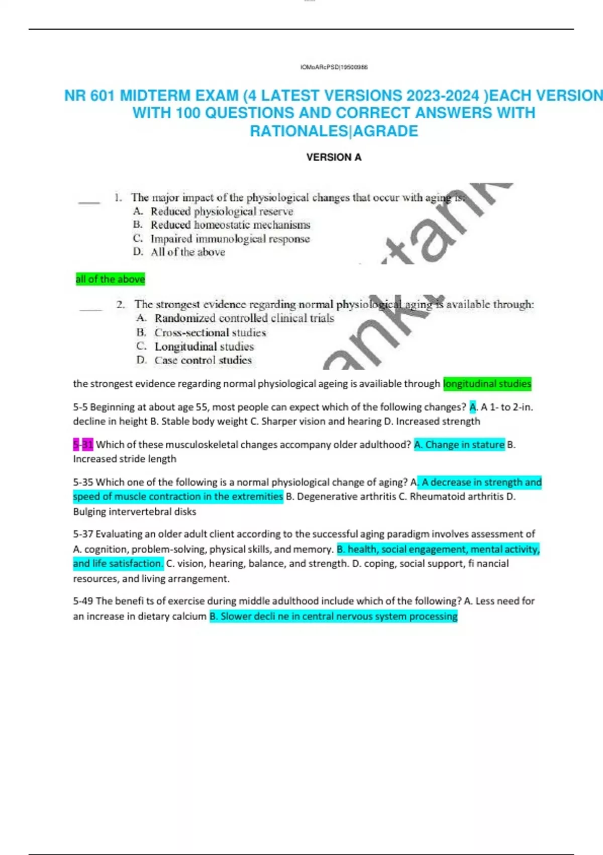 NR 601 MIDTERM EXAM (4 LATEST VERSIONS )EACH VERSION WITH 100 QUESTIONS AND CORRECT ANSWERS WITH RATIONALES|AGRADE VERSION A all of the above the strongest evidence regarding normal physiological ageing is availiable through longitudinal studies 5-5 Beginning at about age 55, most people can expect which of the following changes? A. A 1- to 2-in. decline in height B. Stable body weight C. Sharper vision and hearing D. Increased strength 5-31 Which of these musculoskeletal changes accompany older adulthood? A. Change in stature B. Increased stride length 5-35 Which one of the following is a normal physiological change of aging? A. A decrease in strength and speed of muscle contraction in the extremities B. Degenerative arthritis C. Rheumatoid arthritis D. Bulging intervertebral disks 5-37 Evaluating an older adult client according to the successful aging paradigm involves assessment of A. cognition, problem-solving, physical skills, and memory. B. health, social engagement, mental activity, and life satisfaction. C. vision, hearing, balance, and strength. D. coping, social support, fi nancial resources, and living arrangement. 5-49 The benefi ts of exercise during middle adulthood include which of the following? A. Less need for an increase in dietary calcium B. Slower decli ne in central nervous system processing 5-50 When completing the health history and review of systems for a healthy 88-year-old woman, you would expect which age-related change to be reported? A. Mildly blurry vision B. Chronically dry and itchy eyes and eyelids C. Increasing presbyopia 5-61 Which cognitive change is expected in healthy older adults aged 65 and older? A. Decrease in IQ B. Slower information processing C. Low capacity for learning D. Decreased attentional focus 5-57 Sleep in older adults is characterized by which pattern? A. Increased time spent in REM sleep B. Increased overall sleep time C. Increased sleep latency D. Increased proportion of deep sleep 5-67 Risks for automobile accidents are increased in older adult drivers due to which normal changes associated with aging? A. Decreased ability to understand driving-related dangers B. Lack of recognition of their own physical challenges C. Magnifi ed physiological response to stressful situations D. Increased reaction time 5-85 Older adults face greater risks for fl uid imbalance than young adults and middle adults due to which age-related factor? A. Increased amounts of intracellular fl uid and total body water B. Higher proportion of fat to muscle cells C. Faster speed of metabolism D. Increased intestinal motility 5-86 Which strategy for care of older adults is inconsistent with an approach supportive of aging in place? A. Make changes to the home environment that can accommodate an individual’s changing needs. B. Refer for home care and adult day-care services. C. Hire assistants to help with activities of daily living. D. Emphasize the individual’s limitations and likely need for long-term care placement. 5-96 Which theory of aging focuses on older adults’ development of specifi c strategies to manage losses of function over time? A. Disengagement theory B. Activity/developmental task theory C. Person- environment fi t theory D. Selective optimization with compensation theory 5-107 Why is Alzheimer’s disease (AD) considered a specifi c disease, distinct from the normal . changes of aging? A. There are types of AD that are inherited and present before age 60. B. There are changes in biological processes that occur with normal aging. C. There is a notable decline in cognitive functioning as people age. D. There are multiple changes in organ functioning, especially in the brain. 5-115 Physiological changes of aging can affect functional mobility. Screening for functional mobility of older adults involves which screening tool? A. Katz Index B. Get Up and Go Test C. Functional Independence Measure D. Mini Mental State Exam 5-112 Your 66-year-old patient is able to correctly interpret the meaning of the proverb “A penny saved is a penny earned.” This helps to establish the patient’s expected ability to A. access long-term memory. B. engage in abstract reasoning. C. execute concrete operations. D. follow complex instructions. 13-68 In the older adult, which physiological change affects pharmacokinetics? A. Decreased creatinine clearance B. Increased lean muscle mass C. Decreased total body fat D. Increased serum albumin level 18-98 Physiological changes in the immune system of older adults include A. an inc