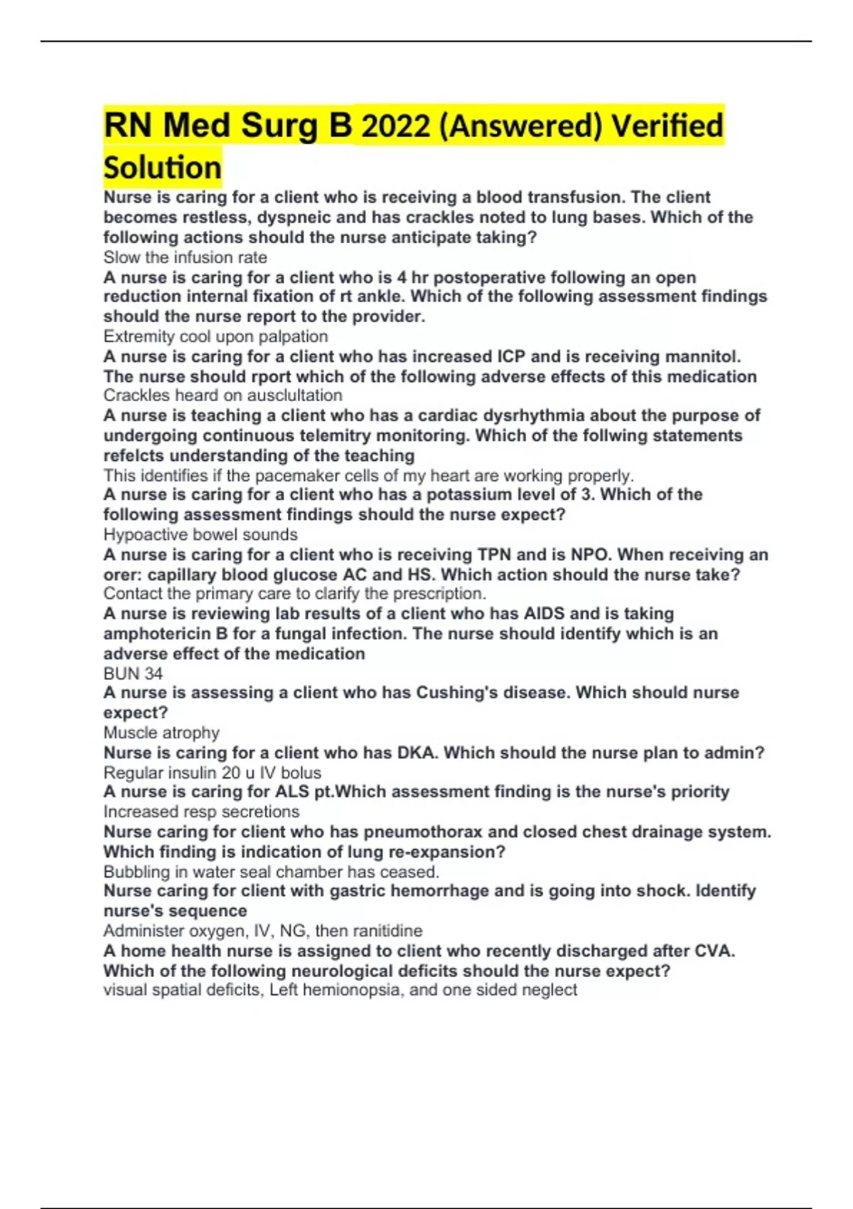 Nurse is caring for a client who is receiving a blood transfusion. The client becomes restless, dyspneic and has crackles noted to lung bases. Which of the following actions should the nurse anticipate taking? Slow the infusion rate A nurse is caring for a client who is 4 hr postoperative following an open reduction internal fixation of rt ankle. Which of the following assessment findings should the nurse report to the provider. Extremity cool upon palpation A nurse is caring for a client who has increased ICP and is receiving mannitol. The nurse should rport which of the following adverse effects of this medication Crackles heard on ausclultation A nurse is teaching a client who has a cardiac dysrhythmia about the purpose of undergoing continuous telemitry monitoring. Which of the follwing statements refelcts understanding of the teaching This identifies if the pacemaker cells of my heart are working properly. A nurse is caring for a client who