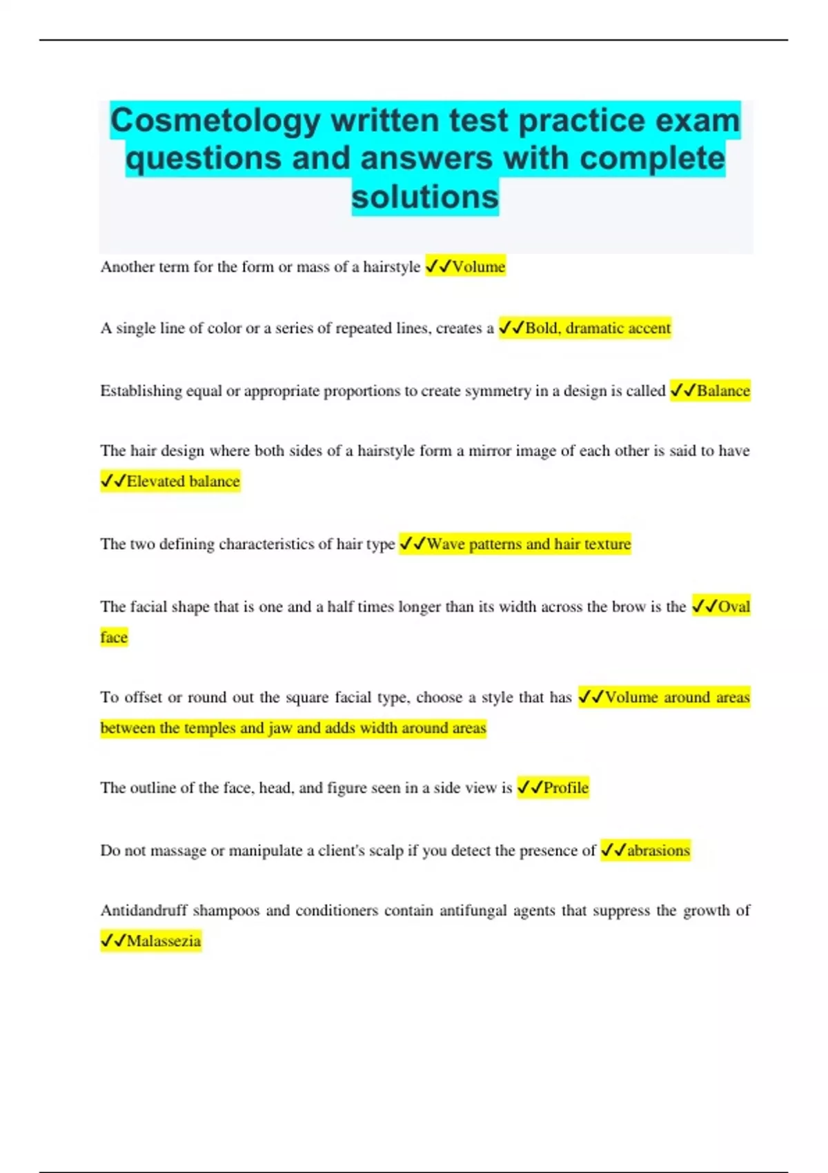 Another term for the form or mass of a hairstyle Volume A single line of color or a series of repeated lines, creates a Bold, dramatic accent Establishing equal or appropriate proportions to create symmetry in a design is called Balance The hair design where both sides of a hairstyle form a mirror image of each other is said to have Elevated balance The two defining characteristics of hair type Wave patterns and hair texture The facial shape that is one and a half times longer than its width across the brow is the Oval face To offset or round out the square facial type, choose a style that has Volume around areas between the temples and jaw and adds width around areas The outline of the face, head, and figure seen in a side view is Profile Do not massage or manipulate a client's scalp if you detect the presence of abrasions Antidandruff shampoos and conditioners contain antifungal agents that suppress the growth of Malassezia