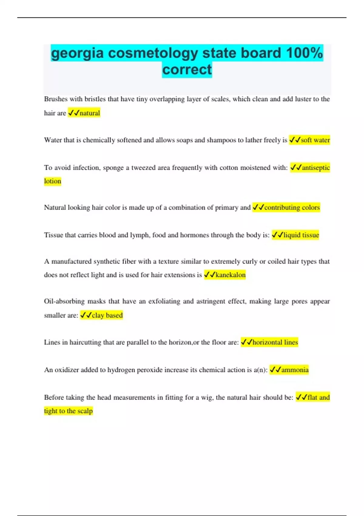 Brushes with bristles that have tiny overlapping layer of scales, which clean and add luster to the hair are natural Water that is chemically softened and allows soaps and shampoos to lather freely is soft water To avoid infection, sponge a tweezed area frequently with cotton moistened with: antiseptic lotion Natural looking hair color is made up of a combination of primary and contributing colors Tissue that carries blood and lymph, food and hormones through the body is: liquid tissue A manufactured synthetic fiber with a texture similar to extremely curly or coiled hair types that does not reflect light and is used for hair extensions is kanekalon Oil-absorbing masks that have an exfoliating and astringent effect, making large pores appear smaller are: clay based Lines in haircutting that are parallel to the horizon,or the floor are: horizontal lines An oxidizer added to hydrogen peroxide increase its chemical action is a(n): ammonia Before taking the head measurements in fitting for a wig, the natural hair should be: flat and tight to the scalp
