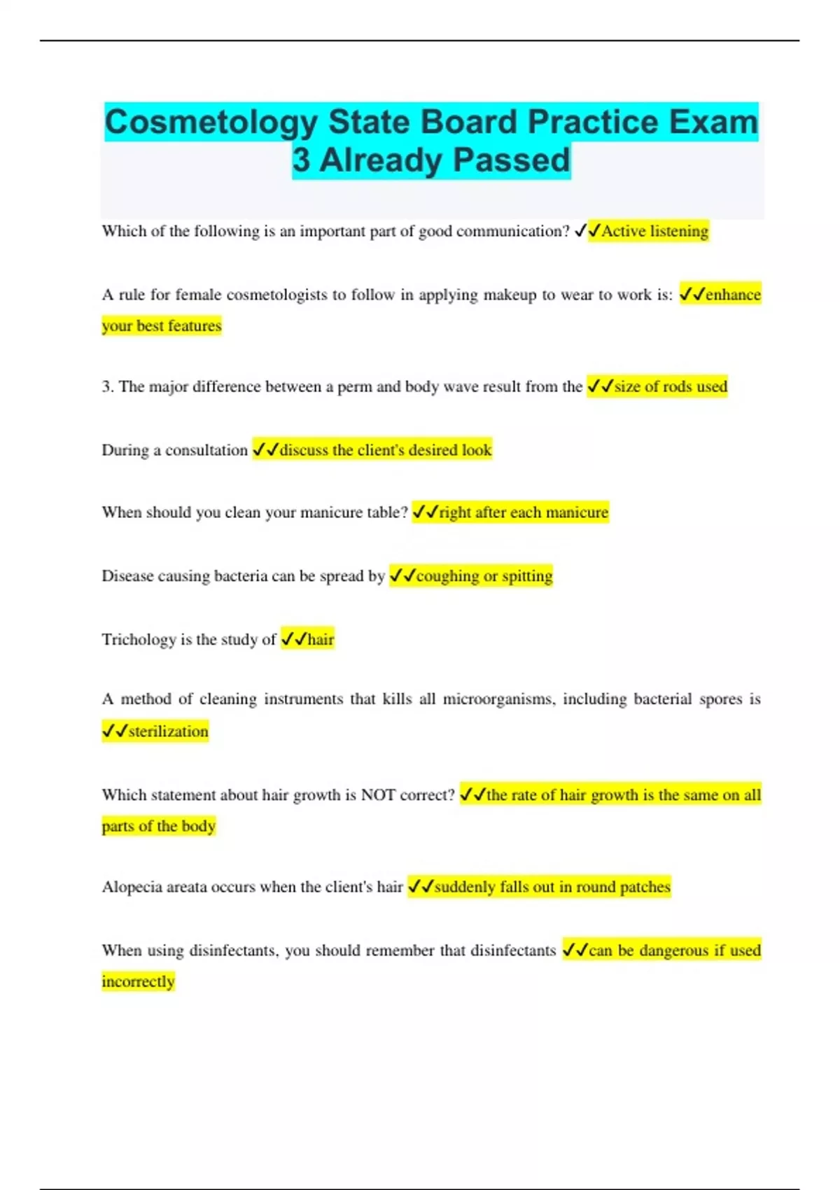Which of the following is an important part of good communication? Active listening A rule for female cosmetologists to follow in applying makeup to wear to work is: enhance your best features 3. The major difference between a perm and body wave result from the size of rods used During a consultation discuss the client's desired look When should you clean your manicure table? right after each manicure Disease causing bacteria can be spread by coughing or spitting Trichology is the study of hair A method of cleaning instruments that kills all microorganisms, including bacterial spores is sterilization Which statement about hair growth is NOT correct? the rate of hair growth is the same on all parts of the body Alopecia areata occurs when the client's hair suddenly falls out in round patches When using disinfectants, you should remember that disinfectants can be dangerous if used incorrectly