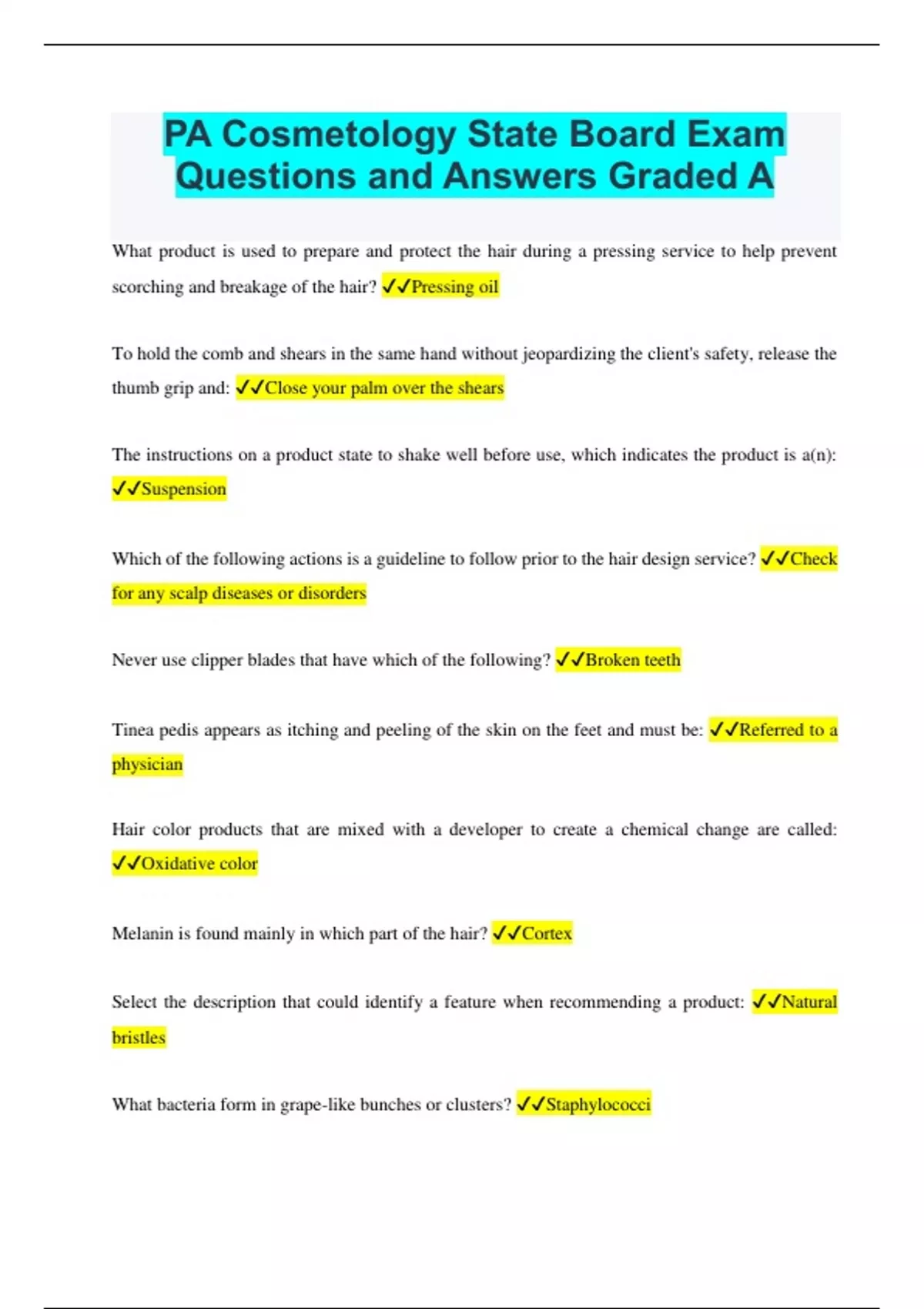 Cosmetology Practice exam Questions and Answers Already Passed