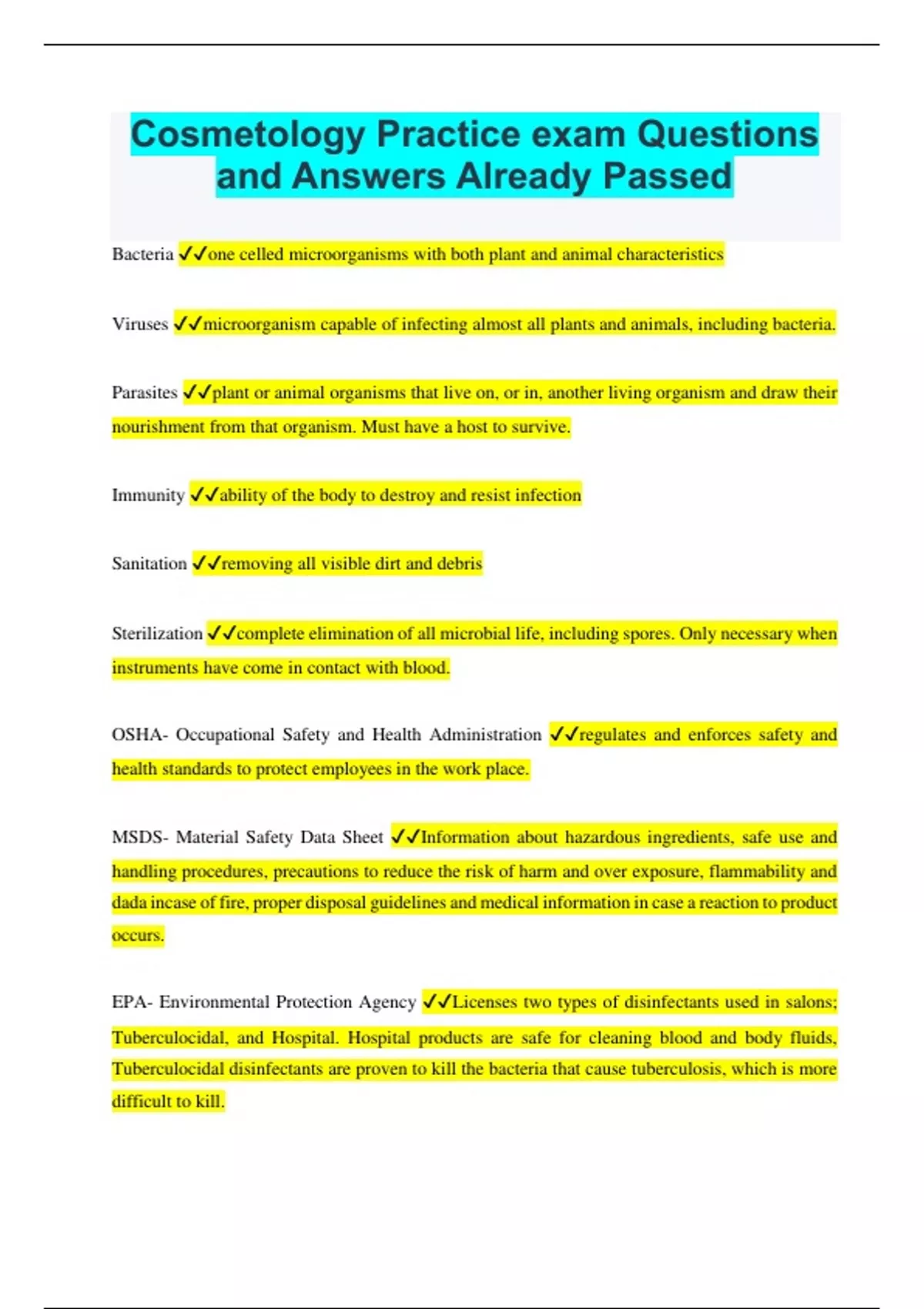 Bacteria one celled microorganisms with both plant and animal characteristics Viruses microorganism capable of infecting almost all plants and animals, including bacteria. Parasites plant or animal organisms that live on, or in, another living organism and draw their nourishment from that organism. Must have a host to survive. Immunity ability of the body to destroy and resist infection Sanitation removing all visible dirt and debris Sterilization complete elimination of all microbial life, including spores. Only necessary when instruments have come in contact with blood. OSHA- Occupational Safety and Health Administration regulates and enforces safety and health standards to protect employees in the work place. MSDS- Material Safety Data Sheet Information about hazardous ingredients, safe use and handling procedures, precautions to reduce the risk of harm and over exposure, flammability and dada incase of fire, proper disposal guidelines and medical information in case a reaction to product occurs. EPA- Environmental Protection Agency Licenses two types of disinfectants used in salons; Tuberculocidal, and Hospital. Hospital products are safe for cleaning blood and body fluids, Tuberculocidal disinfectants are proven to kill the bacteria that cause tuberculosis, which is more difficult to kill.