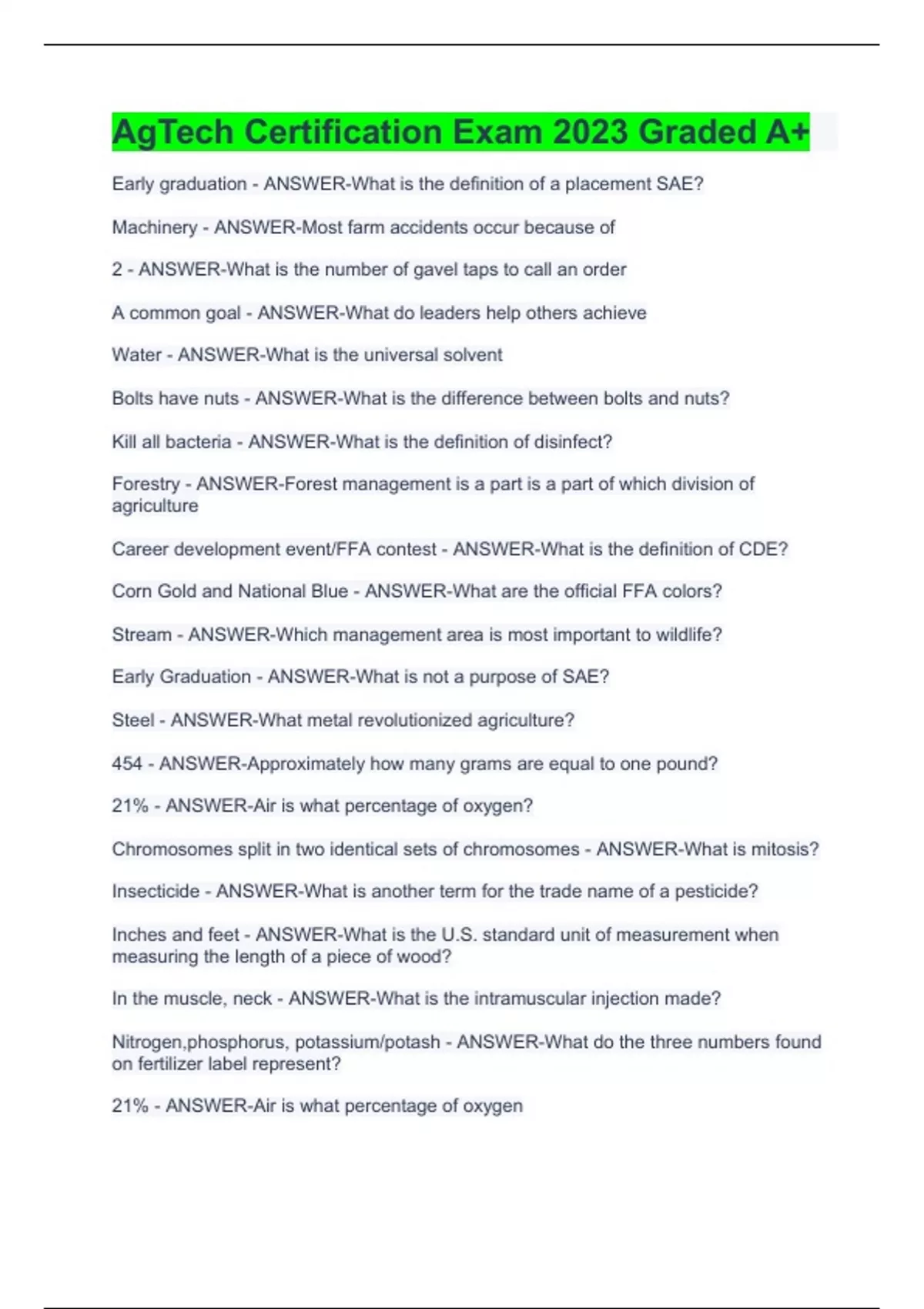 Early graduation - ANSWER-What is the definition of a placement SAE? Machinery - ANSWER-Most farm accidents occur because of 2 - ANSWER-What is the number of gavel taps to call an order A common goal - ANSWER-What do leaders help others achieve Water - ANSWER-What is the universal solvent Bolts have nuts - ANSWER-What is the difference between bolts and nuts? Kill all bacteria - ANSWER-What is the definition of disinfect? Forestry - ANSWER-Forest management is a part is a part of which division of agriculture Career development event/FFA contest - ANSWER-What is the definition of CDE? Corn Gold and National Blue - ANSWER-What are the official FFA colors? Stream - ANSWER-Which management area is most important to wildlife? Early Graduation - ANSWER-What is not a purpose of SAE? Steel - ANSWER-What metal revolutionized agriculture? 454 - ANSWER-Approximately how many grams are equal to one pound? 21% - ANSWER-Air is what percentage of oxygen? Chromosomes split in two identical sets of chromosomes - ANSWER-What is mitosis? Insecticide - ANSWER-What is another term for the trade name of a pesticide? Inches and feet - ANSWER-What is the U.S. standard unit of measurement when measuring the length of a piece of wood? In the muscle, neck - ANSWER-What is the intramuscular injection made? Nitrogen,phosphorus, potassium/potash - ANSWER-What do the three numbers found on fertilizer label represent? 21% - ANSWER-Air is what percentage of oxygen
