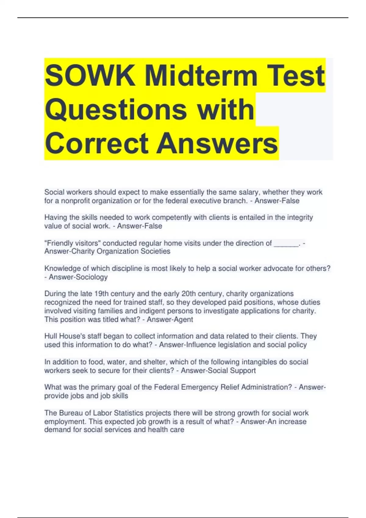 SOWK Midterm Test Questions with Correct Answers Social workers should expect to make essentially the same salary, whether they work for a nonprofit organization or for the federal executive branch. - Answer-False Having the skills needed to work competently with clients is entailed in the integrity value of social work. - Answer-False "Friendly visitors" conducted regular home visits under the direction of ______. - Answer-Charity Organization Societies Knowledge of which discipline is most likely to help a social worker advocate for others? - Answer-Sociology During the late 19th century and the early 20th century, charity organizations recognized the need for trained staff, so they developed paid positions, whose duties involved visiting families and indigent persons to investigate applications for charity. This position was titled what? - Answer-Agent Hull House's staff began to collect information and data related to their clients. They used this information to do what? - Answer-Influence legislation and social policy In addition to food, water, and shelter, which of the following intangibles do social workers seek to secure for their clients? - Answer-Social Support What was the primary goal of the Federal Emergency Relief Administration? - Answer-provide jobs and job skills The Bureau of Labor Statistics projects there will be strong growth for social work employment. This expected job growth is a result of what? - Answer-An increase demand for social services and health care The Food Stamp program was established ______. - Answer-As part of President Johnson's movement toward a Great Society First generation rights - Answer-Consists of civil and political rights Second generation rights - Answer-economic, social and cultural rights Third generation rights - Answer-Includes the right to peace, a clean environment, and a system of fair trade Jane Addams - Answer-Helped to found the NAACP Sophonisba Breckinridge - Answer-promoted rights and humane treatment for offenders through participation in the International Penal and Prison Congress