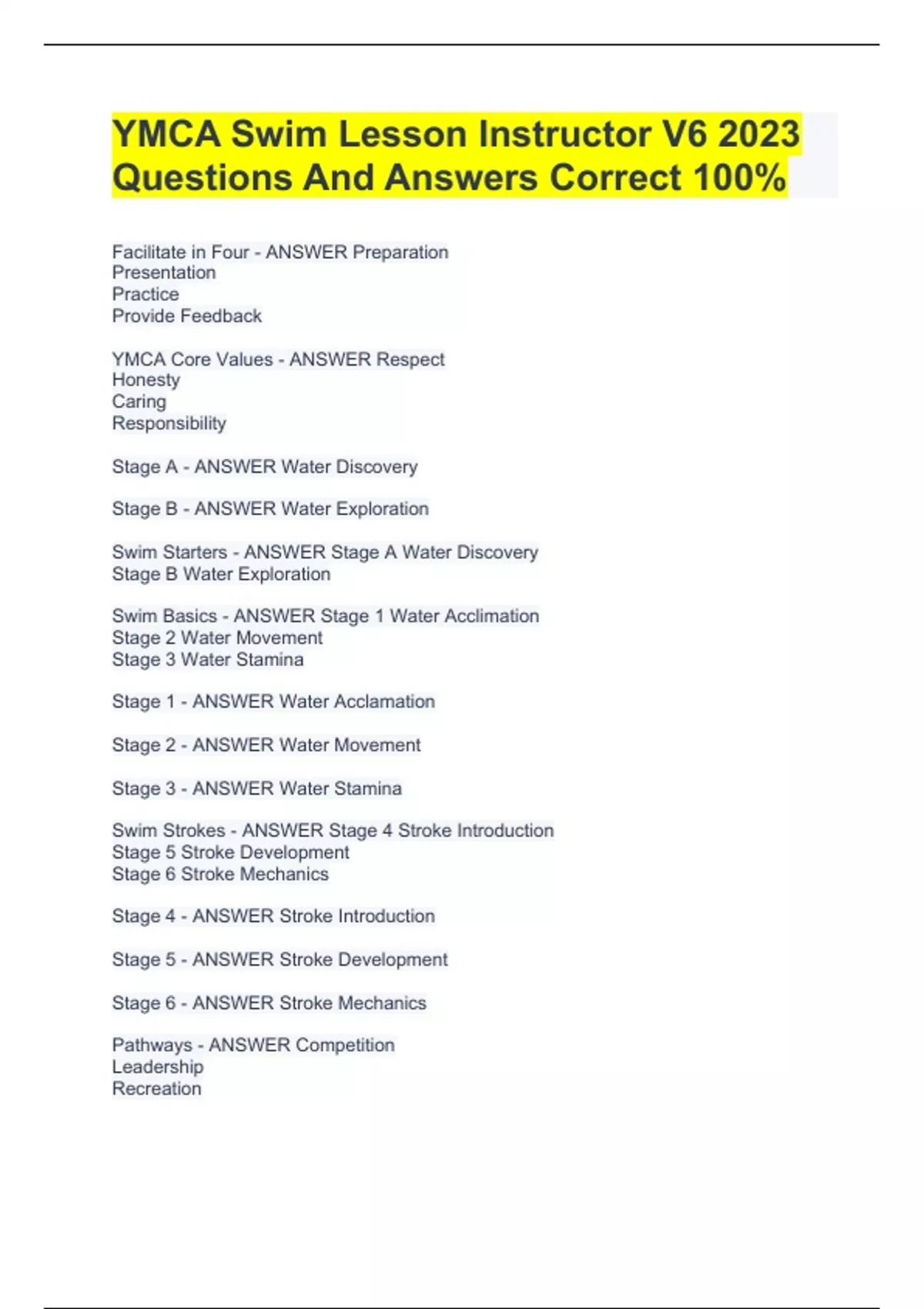 Facilitate in Four - ANSWER Preparation Presentation Practice Provide Feedback YMCA Core Values - ANSWER Respect Honesty Caring Responsibility Stage A - ANSWER Water Discovery Stage B - ANSWER Water Exploration Swim Starters - ANSWER Stage A Water Discovery Stage B Water Exploration Swim Basics - ANSWER Stage 1 Water Acclimation Stage 2 Water Movement Stage 3 Water Stamina Stage 1 - ANSWER Water Acclamation Stage 2 - ANSWER Water Movement Stage 3 - ANSWER Water Stamina Swim Strokes - ANSWER Stage 4 Stroke Introduction Stage 5 Stroke Development Stage 6 Stroke Mechanics Stage 4 - ANSWER Stroke Introduction Stage 5 - ANSWER Stroke Development Stage 6 - ANSWER Stroke Mechanics Pathways - ANSWER Competition Leadership Recreation Parent/Child - ANSWER Stages A & B Preschool - ANSWER Stages 1, 2, 3 & 4 School Age - ANSWER Stages 1, 2, 3, 4, 5 & 6 Teen/Adult - ANSWER Stages 1, 2, 3, 4, 5 & 6 YISA - ANSWER YMCA Instructor Safety Assistant