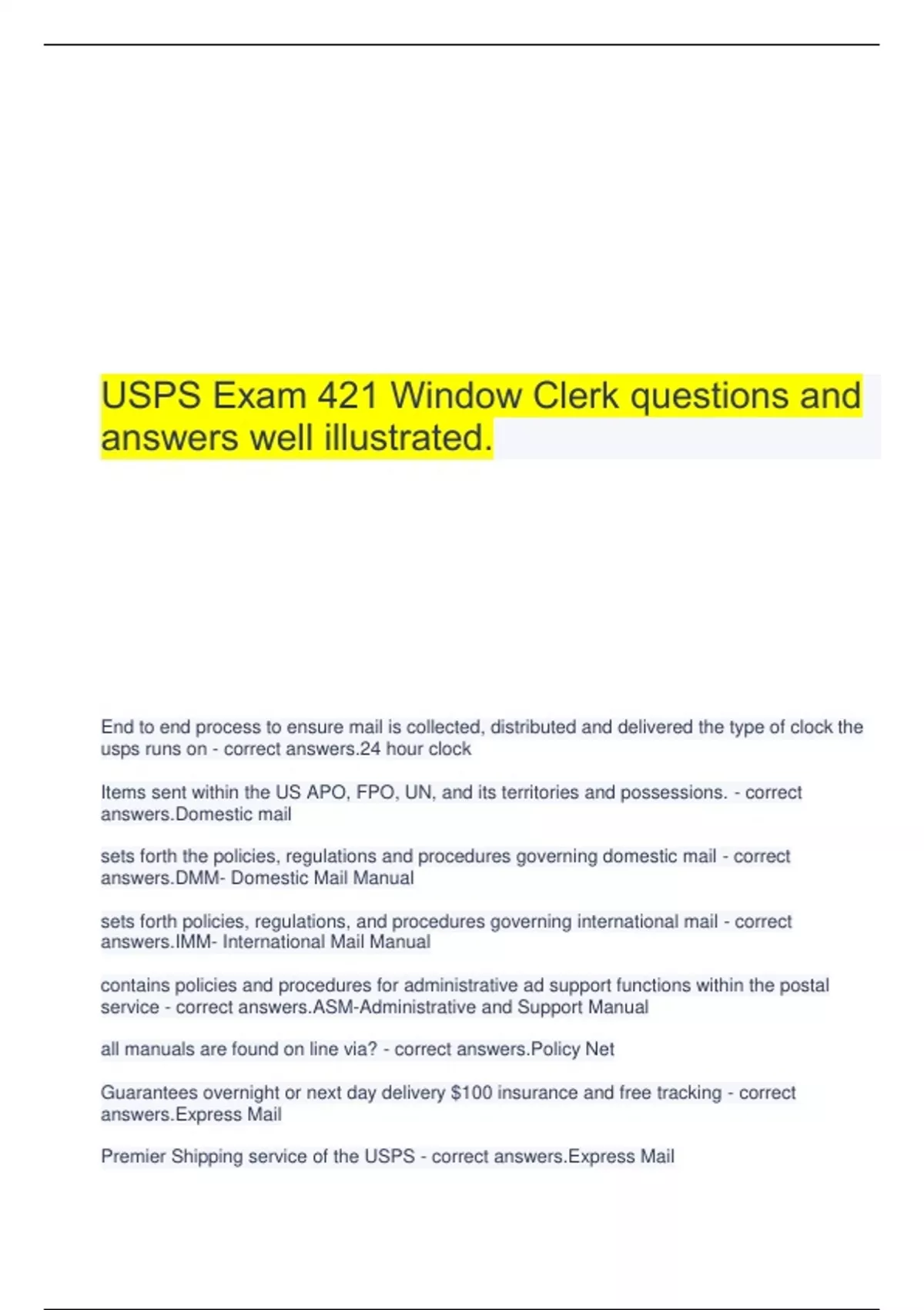 USPS Exam 421 Window Clerk questions and answers well illustrated. End to end process to ensure mail is collected, distributed and delivered the type of clock the usps runs on - correct answers.24 hour clock Items sent within the US APO, FPO, UN, and its territories and possessions. - correct answers.Domestic mail sets forth the policies, regulations and procedures governing domestic mail - correct answers.DMM- Domestic Mail Manual sets forth policies, regulations, and procedures governing international mail - correct answers.IMM- International Mail Manual contains policies and procedures for administrative ad support functions within the postal service - correct answers.ASM-Administrative and Support Manual all manuals are found on line via? - correct answers.Policy Net Guarantees overnight or next day delivery $100 insurance and free tracking - correct answers.Express Mail Premier Shipping service of the USPS - correct answers.Express Mail Fast and affordable max 70lbs $50 insurance another premier shipping service of the USPS 2-3 DAYS delivery - correct answers.Priority Mail Bulk mail usually handled at distribution centers - correct answers.Parcel Select Merchant pays postal fee returning merchandise bulk parcel return product - correct answers.Parcel Return Services First class mail, periodicals, standard mail, package services - correct answers.Mailing services proof of mailing uses PS Form 3800 - correct answers.Certified Mail Provides up to $5000 in coverage extra service requires PS Form 3813 or 3813-p - correct answers.Insured Mail Provides date and time of delivery, free when you purchase Priority mail now called USPS Tracking - correct answers.Delivery Confirmation POM - correct answers.Postal Operations Manual Official Source for updates and updated bi-weekly - correct answers.Postal bulletin Does this package contain anything liquid, fragile, potentially hazardous' such as/like perfume or lithium batteries? - correct answers.6 Part of HAZMAT question Tells you when and how to display the POW flag - correct answers.Postal Bulletin POW - correct answers.Prisoner of War Bears only stamps as postage weights more than 13 oz and was not excepted at retail counter. - correct answers.Anonymous Mail PVI - correct answers.Postage Validation Imprinter AMU - correct answers.Anonymous Mail Unit DDD1 - correct answers.Weighs less than 13 oz DDD2 - correct answers.Weighs more than 13 oz Magazines, newspaper, must be printed at least 4x's times a year from a creditable organization - correct answers.Periodicals Parcel post, bonded printed matter media mail, library mail - correct ge services printed matter weighs less than 16 oz must pay annual presort fee min. of 200 pieces or over 50 lbs - correct answers.Standard Mail can be used for gifts weighs up to 70lbs measures max of 130in price based on weigh distance and shape - correct answers.Parcel Post Delivery time 2-3 days( not guaranteed ) - correct answers.Priority Mail Delivery time 1-2 days ( overnight and next day ) * Guaranteed - correct answers.Express mail ( Priority Mail Express ) Letters size max - correct answers.6 1/8in in height and 11 1/2in in length max 1/4in in thickness Flats size max - correct answers.15in in length and 12in in height and 3/4in in thickness Machinable Parcels - correct 3in max 17in weight 6 oz min and 25lbs max Rolls that are longer than machinable parcels - correct answers.Irregular Parcels How many zones - correct answers.8 effects zones 1-4 piece weighs less than 20lbs but longer than 84in and is charged the 20lb price - correct answers.Balloon Price Effects zones 5-8 can't exceed 1728cu ft max 108in in girth - correct answers.Dimensional Price How often is the Postal bulletin printed - correct answers.Bi-weekly Where do we find a list of lost or stolen MO (money orders) - correct answers.Postal Bulletin and POS Postal Service___________ are available online and provide guidance on regulations for domestic/international/administrative/personnel fields support? - correct answers.Directives Priority Mail is delivered in - correct answers.2-3 days any mailable item that weighs less than 13 oz - correct answers.First Class Mail Global Express Guarantee (GXG) is shipped in - correct answers.1-3 days No mail piece can weigh more than except standard post - correct answers.70lbs EDDM - correct answers.Every Door Direct Mail Express mail is delivered in - correct answers.1-2 days what surcharge applies to items/parcels over 108 but no more than 130in - correct ize /parcel post PS Form 3816 - correct answers.COD PS Form 3816-AS - correct answers.More than 3 COD articles are mailed at one time Parcel Post and zones 5-8 larger than 1 cubic foot use - correct answers.Dimensional Pricing Ensures that mail is delivered to a specific addressee or the addressee agent for a fee - correct answers.Restricted delivery Post Office motto for providing the ideal customer experience - correct answers.Clean, Stocked, and Friendly Everyday