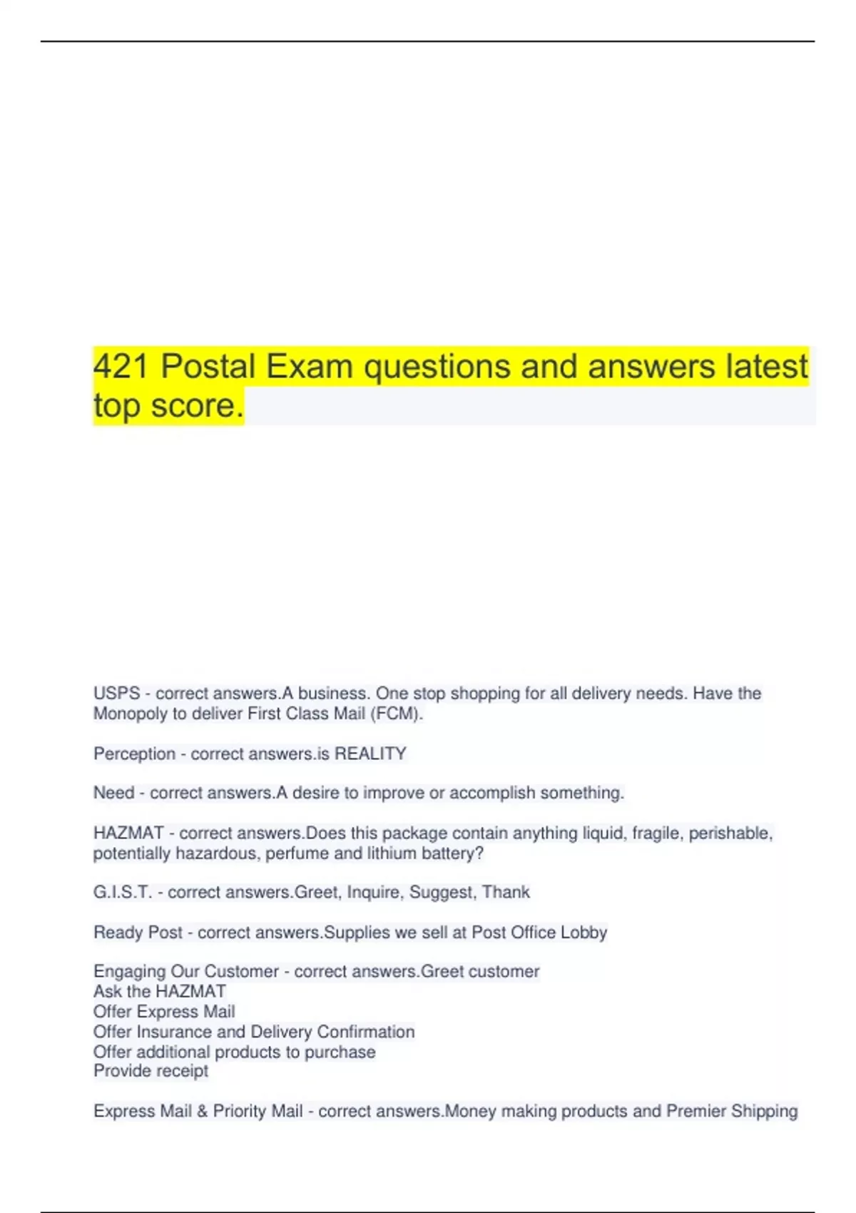 421 Postal Exam questions and answers latest top score. USPS - correct answers.A business. One stop shopping for all delivery needs. Have the Monopoly to deliver First Class Mail (FCM). Perception - correct REALITY Need - correct answers.A desire to improve or accomplish something. HAZMAT - correct answers.Does this package contain anything liquid, fragile, perishable, potentially hazardous, perfume and lithium battery? G.I.S.T. - correct answers.Greet, Inquire, Suggest, Thank Ready Post - correct answers.Supplies we sell at Post Office Lobby Engaging Our Customer - correct answers.Greet customer Ask the HAZMAT Offer Express Mail Offer Insurance and Delivery Confirmation Offer additional products to purchase Provide receipt Express Mail & Priority Mail - correct answers.Money making products and Premier Shipping Express Mail - correct answers.1-2 Days Guaranteed Delivery $100 Insurance Coverage If it fits it ships. Priority Mail - correct answers.2-3 Days Guaranteed Delivery $50 Insurance Coverage 70 lbs. max and 108 inches max combined length and girth Parcel Select - correct answers.70 lbs. max and 130 inches max combined length and girth Ground Delivery (Bulk) Designed for Large and Medium Mailers Processing Categories: - correct answers.Letter Flats Machinable Parcel Irregular Parcel Outside Parcel Letter Size - correct answers.Rectangular 3 1/2 inches in height 5 inches in length .007 inches in thickness (cubic foot) weigh 3 1/2 ounces FLATS - correct answers.F - Flexible U - Uniformly Thick R - Rectangular Machinable Parcel - correct answers.Weigh minimum 6 ounces and 25 lbs. max Irregular Parcel - correct answers.Weigh less than 6 ounces Rolls and tubes up to 26" 70 lbs. max Outside Parcel - correct minimum 25 lbs and 70 lbs. max Tires, Metal and Wood Boxes Surcharges - correct answers.Rigid, Uneven Thickness, Letter Enclosed in Plastic, Clasp... .21 cents charged Promoting Premier Products: - correct answers.Priority Express Mail Priority Mail Insured Mail Priority Express Mail - correct answers.Time sensitive letters / Overnight 1-2 Days Delivery with $100 Insurance No Saturday Delivery Charges Free Tracking and Signature Confirmation Priority Mail - correct answers.2-3 Days Delivery with $50 Insurance No Saturday Delivery Charges Weighs up to 70 lbs. Extra Service available Insured Mail - correct answers.Maximum of $5000 Insurance Can purchase Online, Post Office, Self-Service Kiosk P.O. Boxes - correct answers.Fast delivery, mail available prior delivery, private, affordable, convenient. Always due on the last day of the month. WebBATS - correct answers.Software program for the P.O. Boxes PS Form 1093 - correct answers.P.O. Box Application PS Form 3533 - correct answers.P.O. Box Refund Form Application Every Door Delivery Mail (EDDM) - correct answers.Flats Only No Permit Required Destnating to a single Post Office Dimensional Weight Pricing - correct answers.Priority Only Zones 5-8 and over one cubic foot (.007 inches) Balloon Price - correct answers.Priority Mail Zones 1-4 ; STD Parcel Post (All Zones) 84 inches and 108 combined length and girth (less than 20 lbs.) Oversized Price - correct answers.Postal Post (surcharge) Up to 70 lbs. Over 108 inches but less than 130 inches combined length and girth Travel by ground ONLY What is the difference between Mailing Services and Shipping Services? - correct answers.Mailing Services - NO Competition Shipping Serices - with Competition Mailing Services - correct answers.First Class Mail (FCM) Periodicals Standard Mail (STD) Package Services Extra Services First Class Mail (FCM) - correct answers.1-3 Days Delivery Weighs 13 ounces Not Zone Rated Periodicals - correct answers.Magazines and newspaper and received @ BMEU Standard Mail (STD) - correct answers.Flyers, newsletter, junk mails, 16 ounces No STD mails received at the window counter Package Services - correct answers.Bound Printed Matter - up to 15 lbs. Library Mail - less than 70 lbs. Media Mail - less than 70 lbs. Standard Post - up to 70 lbs.