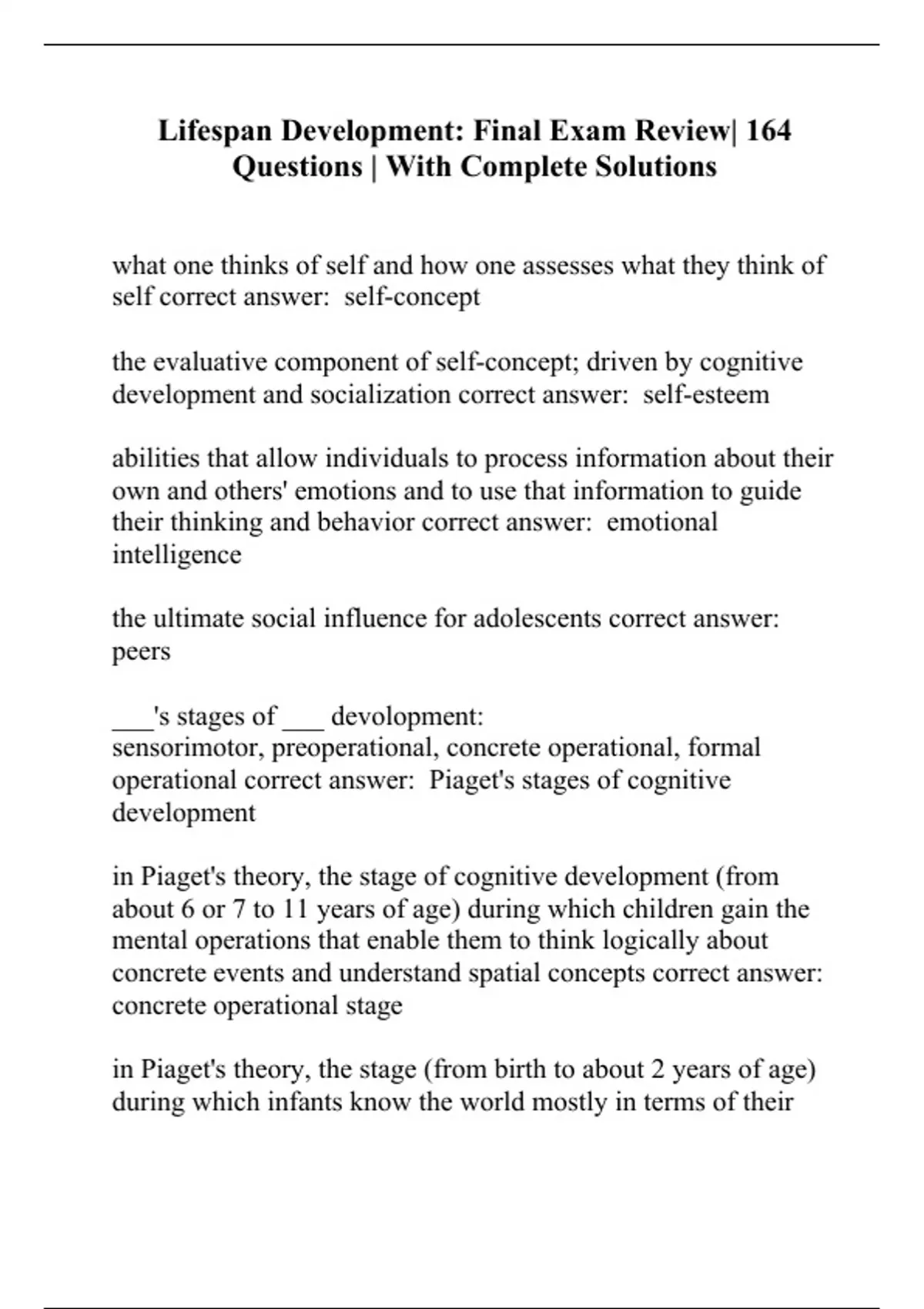 Lifespan Development: Final Exam Review| 164 Questions | With Complete Solutions