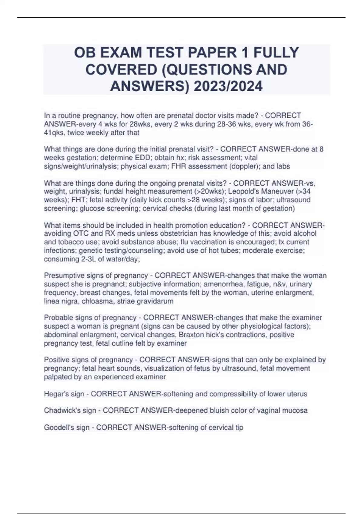 OB EXAM TEST PAPER 1 FULLY COVERED (QUESTIONS AND ANSWERS) 2023/2024 In a routine pregnancy, how often are prenatal doctor visits made? - CORRECT ANSWER-every 4 wks for 28wks, every 2 wks during 28-36 wks, every wk from 36- 41qks, twice weekly after that What things are done during the initial prenatal visit? - CORRECT ANSWER-done at 8 weeks gestation; determine EDD; obtain hx; risk assessment; vital signs/weight/urinalysis; physical exam; FHR assessment (doppler); and labs What are things done during the ongoing prenatal visits? - CORRECT ANSWER-vs, weight, urinalysis; fundal height measurement (>20wks); Leopold's Maneuver (>34 weeks); FHT; fetal activity (daily kick counts >28 weeks); signs of labor; ultrasound screening; glucose screening; cervical checks (during last month of gestation) What items should be included in health promotion education? - CORRECT ANSWERavoiding OTC and RX meds unless obstetrician has knowledge of this; avoid alcohol and tobacco use; avoid substance abuse; flu vaccination is encouraged; tx current infections; genetic testing/counseling; avoid use of hot tubes; moderate exercise; consuming 2-3L of water/day; Presumptive signs of pregnancy - CORRECT ANSWER-changes that make the woman suspect she is pregnanct; subjective information; amenorrhea, fatigue, n&v, urinary frequency, breast changes, fetal movements felt by the woman, uterine enlargment, linea nigra, chloasma, striae gravidarum Probable signs of pregnancy - CORRECT ANSWER-changes that make the examiner suspect a woman is pregnant (signs can be caused by other physiological factors); abdominal enlargment, cervical changes, Braxton hick's contractions, positive pregnancy test, fetal outline felt by examiner Positive signs of pregnancy - CORRECT ANSWER-signs that can only be explained by pregnancy; fetal heart sounds, visualization of fetus by ultrasound, fetal movement palpated by an experienced examiner Hegar's sign - CORRECT ANSWER-softening and compressibility of lower uterus Chadwick's sign - CORRECT ANSWER-deepened bluish color of vaginal mucosa Goodell's sign - CORRECT ANSWER-softening of cervical tip Ballottement - CORRECT ANSWER-rebound of unengaged fetus Nagele's rule - CORRECT ANSWER-way to calculate estimated due date; first day of LMP, subtract 3 months, then add 7 days McDonald's method - CORRECT ANSWER-way to calculate estimated gestational age; after 20 wks, measure fundal height and # of centimeters should correlate with # of weeks of gestation gravidity - CORRECT ANSWER-number of pregnancies Nulligravida - CORRECT ANSWER-a woman who has never been pregnant Primigravida - CORRECT ANSWER-a woman in her first pregnancy Multigravida - CORRECT ANSWER-a woman who has been pregnant more than once Parity - CORRECT ANSWER-number of pregnancies in which the fetus reached viable age (20 wks) Nullipara - CORRECT ANSWER-no pregnancies in which fetus reached viable age Primipara - CORRECT ANSWER-one pregnancy in which fetus reached viable age Multipara - CORRECT ANSWER-more than one pregnancy in which the fetus reached viable age What does GTPAL stand for when using the 5 stage system? - CORRECT ANSWERGravida (# of pregnancies); Term(> 38 wks); Preterm(<38 weeks); Abortion; Living Chloasma - CORRECT ANSWER-mask of pregnancy Linea nigra - CORRECT ANSWER-dark line of pigmentation from the umbilicus to the pubic area Striae gravidam - CORRECT ANSWER-stretch marks mostly found on abdomen and thighs How should a nurse evaluate a client's nutritional choices? - CORRECT ANSWERHave the client keep a food journal; calculate amount of calories in each food eaten; have the client fill out questionnaires; monitor weight during visits; lab work What is the recommended increase of calories per day in the second trimester? - CORRECT ANSWER-340 What is the recommended increase of calories per day in the third trimester? - CORRECT ANSWER-452 How many mcg of folic acid should be taken during pregnancy and lactation? - CORRECT ANSWER-600 and 500 What are some supplements that should be taken during pregnancy? - CORRECT ANSWER-calcium and iron What can be used to help manage constipation associated with taking iron supplements? - CORRECT ANSWER-stool softeners How many liters of fluid are recommended during pregnancy? - CORRECT ANSWER2-3 Caffeine should be limited to how many mg/day? - CORRECT ANSWER-300 What are some risk factors that could affect the adequacy of nutritional intake during pregnancy? - CORRECT ANSWER-age, culture, socioeconomic status, education level and specific circumstances that could occur during pregnancy (n&v, etc) How much weight should be gained during the first trimester and thereafter during pregnancy? - CORRECT ANSWER-up to 4 lbs during the first trimester, then 1lb per week for the last two trimesters What birth defect can result from folic acid deficiency during pregnancy? - CORRECT ANSWER-neural tube defects What are some foods that are high in calcium? - CORRECT ANSWER-dark green, leafy vegetables (ex. spinach) What birth defect can result from calcium deficiency? - CORRECT ANSWER-poor teeth and bone formation What birth defect can result from maternal obesity? - CORRECT ANSWER-macrosomic fetus What foods are rich in iron? - CORRECT ANSWER-chicken, meat, and fish What vitamin aids in the absorption of iron? - CORRECT ANSWER-vitamin C What complications could be the cause of vaginal bleeding during the first trimester? - CORRECT ANSWER-abortion or ectopic pregnancy What complications could be the cause of vaginal bleeding during the second trimester? - CORRECT ANSWER-gestational trophoblastic disease What complications could be the cause of vaginal bleeding during the third trimester? - CORRECT ANSWER-placenta previa; abruptio placenta; vasa previa incompetent cervix - CORRECT ANSWER-painless dilation of the cervis in the absence of uterine dilation; cervis is incapable of supporting the weight of the fetus hyperemesis gravidarum - CORRECT ANSWER-excessive nausea and vomiting (related to 