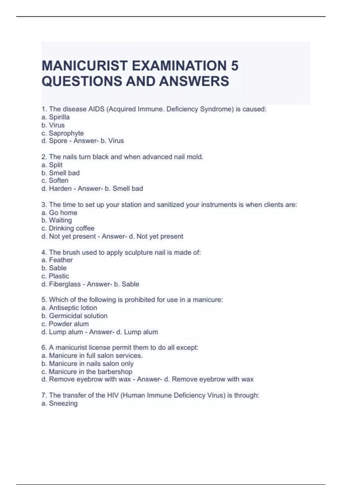 manicurist examination 5 questions and answers
