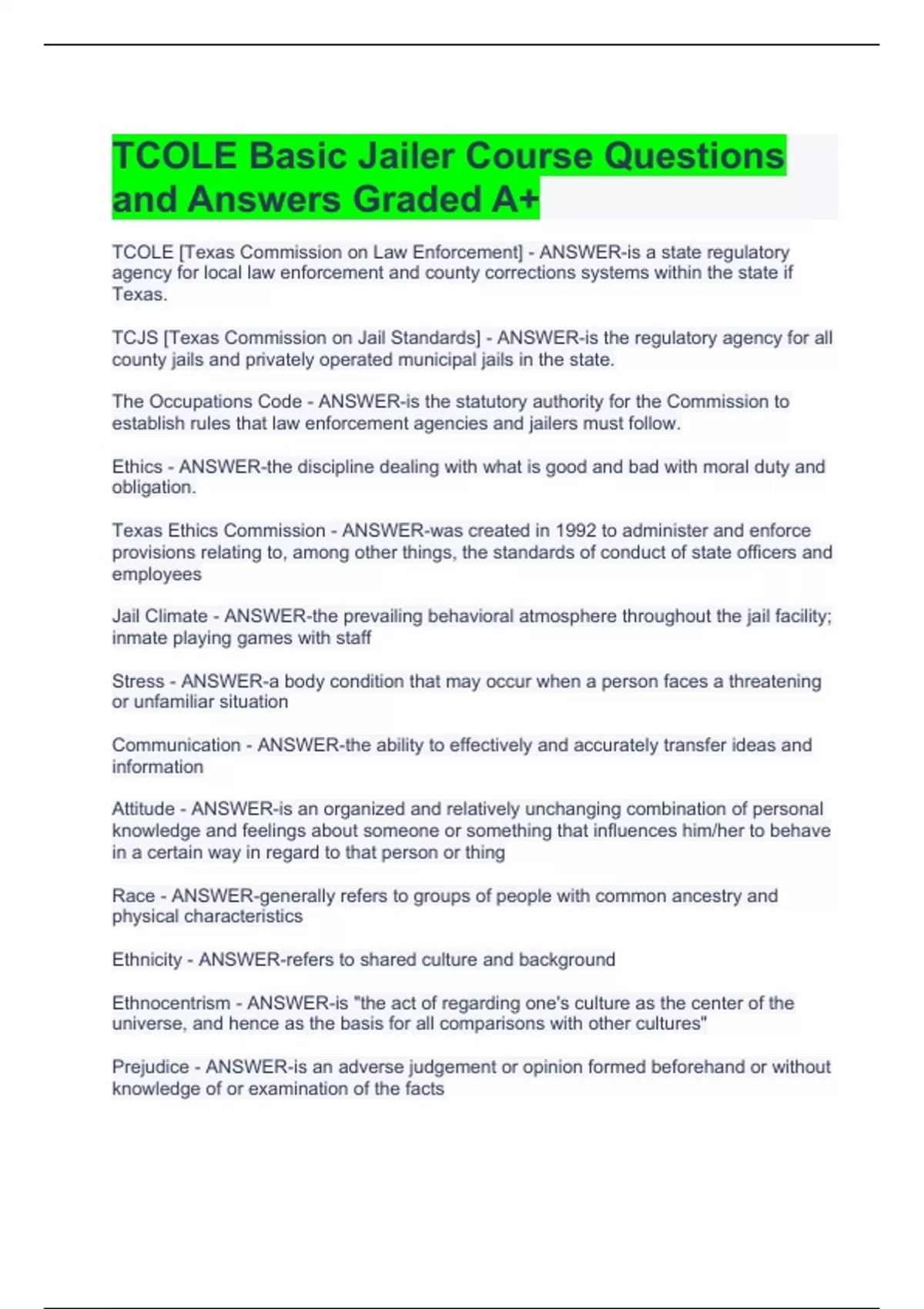 TCOLE Basic Jailer Course Questions and Answers Graded A+