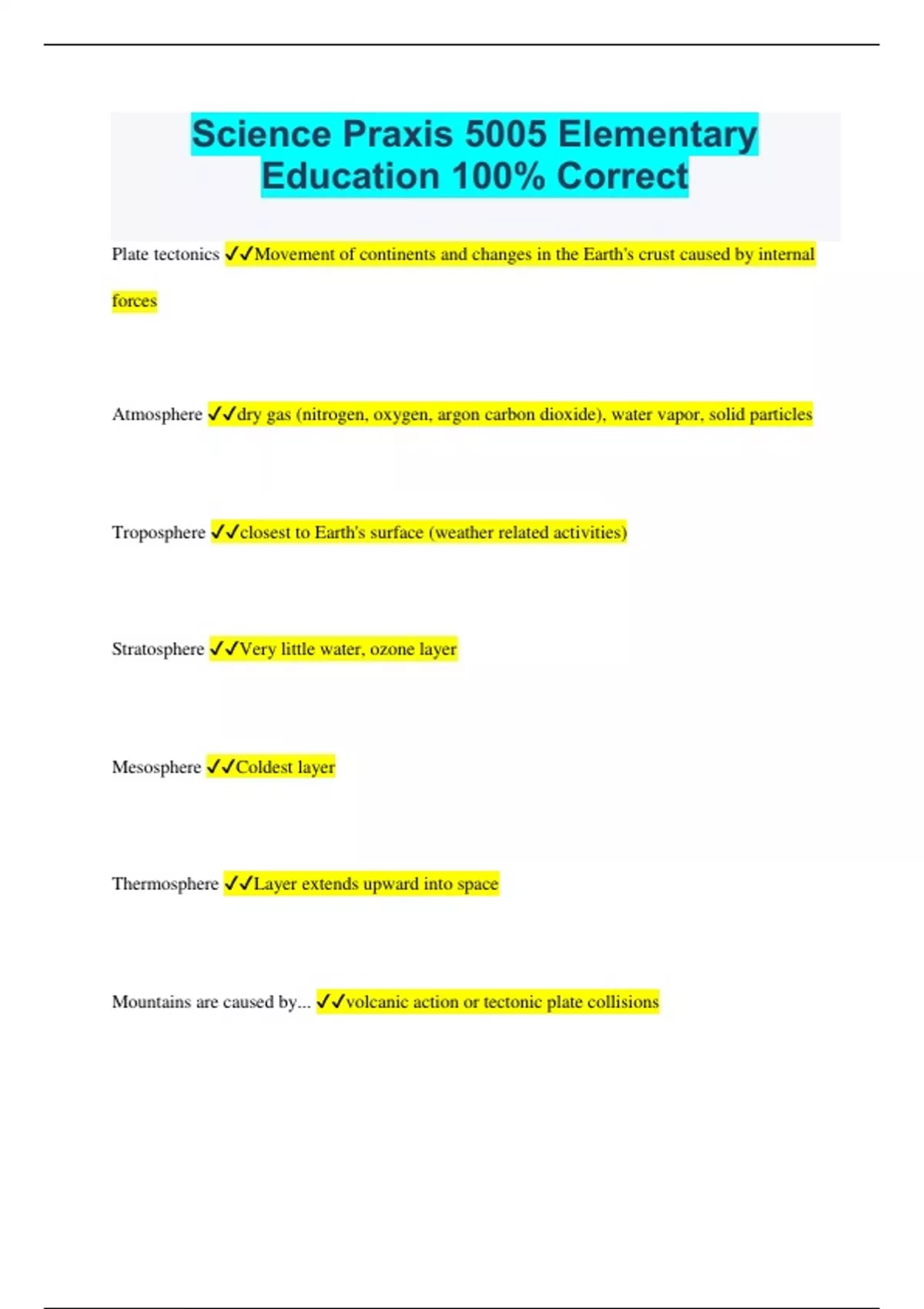 Science Praxis 5005 Elementary Education 100% Correct Plate tectonics Movement of continents and changes in the Earth's crust caused by internal forces Atmosphere dry gas (nitrogen, oxygen, argon carbon dioxide), water vapor, solid particles Troposphere closest to Earth's surface (weather related activities) Stratosphere Very little water, ozone layer Mesosphere Coldest layer Thermosphere Layer extends upward into space Mountains are caused by... volcanic action or tectonic plate collisions Folding folding of rock layers, usually sedimentary rocks Faulting Fractures in Earth's crust because of tension Volcanoes are... the movement of magma through the crust and its emergence as lava onto the Earth's surface Active, Dormant, Extinct, and volcanoes currently/building up to an eruption, between eruptions but internal activity, and no longer erupting Igneous rock formation Intrusive: formed below Earth's surface. Extrusive: formed at Earth's surface Sedimentary Rocks created when fluid sediments are transformed into solid rocks. Cementation is when sediments are converted to sedimentary rocks Igneous Rocks classified according to their texture, composition, and the way they formed. Made from magma (molten Rock) Metamorphic rocks formed by high temperatures and great pressure. Process is called metamorphism. Minerals natural, nonliving solids with a defined chemical composition and crystalline structure Glaciers bodies of ice that move over the land due to gravity. Fossil remains or trace of an ancient organism Erosion transportation of surface materials by another moveable material (water, wind, ice) Deposition AKA Sedimentation, process by which material from one area is slowly deposited into another area. result of matter being eroded. Weathering breaking down of rocks at or near the Earth's Surface The several eras precambrain (no life), paleozoic (continents and sea animals), Mesozoic (reptiles, new landforms), Cenozoic (ice age, mammals, humans evolving) Stratigraphy process of determining the age of rocks Absolute Dating the use of radioactivity to determine Earth's age Planets Mercury, Venus, Earth, Mars, Jupiter, Saturn, Uranus, and Neptune Mercury Closest planet to the sun Jupiter Largest planet in the Solar System Uranus Third largest planet - gaseous planet Pluto dwarf planet Sun: The Core inner portion of the sun - fusion takes place Sun: photosphere surface of the sun, produces sunspots Sun: chromosphere Hydrogen gas causes this portion to be red Sun: The corona The transparent area of the sun visible only during a total eclipse. Stars a ball of hot, glowing gas that is hot enough and dense enough to trigger nuclear reactions. How do astronomers measure the brightness of a star? astronomers measure the brightness of a star by measuring its magnitude. Constellations groups or patterns of stars Familiar constellations Ursa Major (Big bear), Ursa Minor (Little Bear), Big Dipper, Little Dipper Galaxies