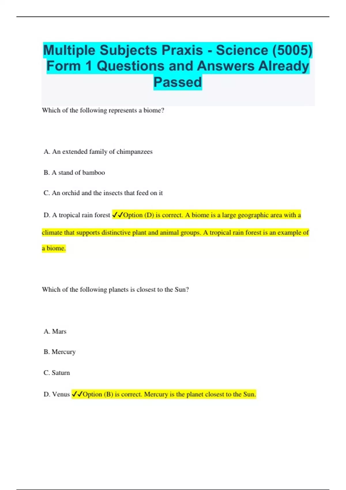 Multiple Subjects Praxis - Science (5005) Form 1 Questions and Answers Already Passed Which of the following represents a biome? A. An extended family of chimpanzees B. A stand of bamboo C. An orchid and the insects that feed on it D. A tropical rain forest Option (D) is correct. A biome is a large geographic area with a climate that supports distinctive plant and animal groups. A tropical rain forest is an example of a biome. Which of the following planets is closest to the Sun? A. Mars B. Mercury C. Saturn D. Venus Option (B) is correct. Mercury is the planet closest to the Sun. Which of the following substances is readily attracted to a magnet? A. Gold B. Nickel C. Carbon D. Nitrogen Option (B) is correct. Nickel, like iron and cobalt, is a metal that is attracted to a magnet. A graduated cylinder is typically used to measure which of the following? A. Temperature B. Composition C. Volume D. Mass Option (C) is correct. A graduated cylinder is typically used to measure volume. Common graduated cylinders range in size from 10 mL to 1 L. Which THREE of the following statements about stars are true? A. The Sun is a star. B. Most stars orbit planets. C. Various stars have different surface temperatures. D. Some stars exist for longer periods than other stars. The correct answers are (A), (C), and (D). The surface temperatures of main-sequence stars largely depend on their mass, which varies from star to star. The Sun is a main-sequence star that generates energy by nuclear fusion of hydrogen. How long stars exist largely depends on their mass. Chloroplasts are found in the cells of which of the following organisms? A. Clams B. Tulips C. Parrots D. Starfish Option (B) is correct. All plant and algal cells contain chloroplasts. Tulips are plants and therefore contain plant cells and chloroplasts. The tendency of an object to resist change in motion is called A. mass B. inertia C. friction D. velocity Option (B) is correct. Inertia is the tendency of a physical object to resist change in motion unless acted on by an outside force. Which of the following best describes how a small saltwater spill should be cleaned up in the elementary classroom? A. Allow the spill to spread so that the water can quickly evaporate, then sweep up the salt. B. Wipe up the spill with paper towels from the outer edge toward the center to minimize the spread of the spill. C. Add water to dilute the salt water and increase the volume of the spill to ensure that all the students can help wipe up the spill. D. Use the classroom sponge to absorb the spill, then squeeze out the salt water into its original container so that it can be reused. Option (B) is correct. Minimizing the area of the saltwater spill while effectively cleaning up the liquid reduces any potential safety hazards that the spill may create. The force of electrostatic attraction increases when which of the following are brought closer together? A. Two negatively charged objects B. Two positively charged objects C. Two