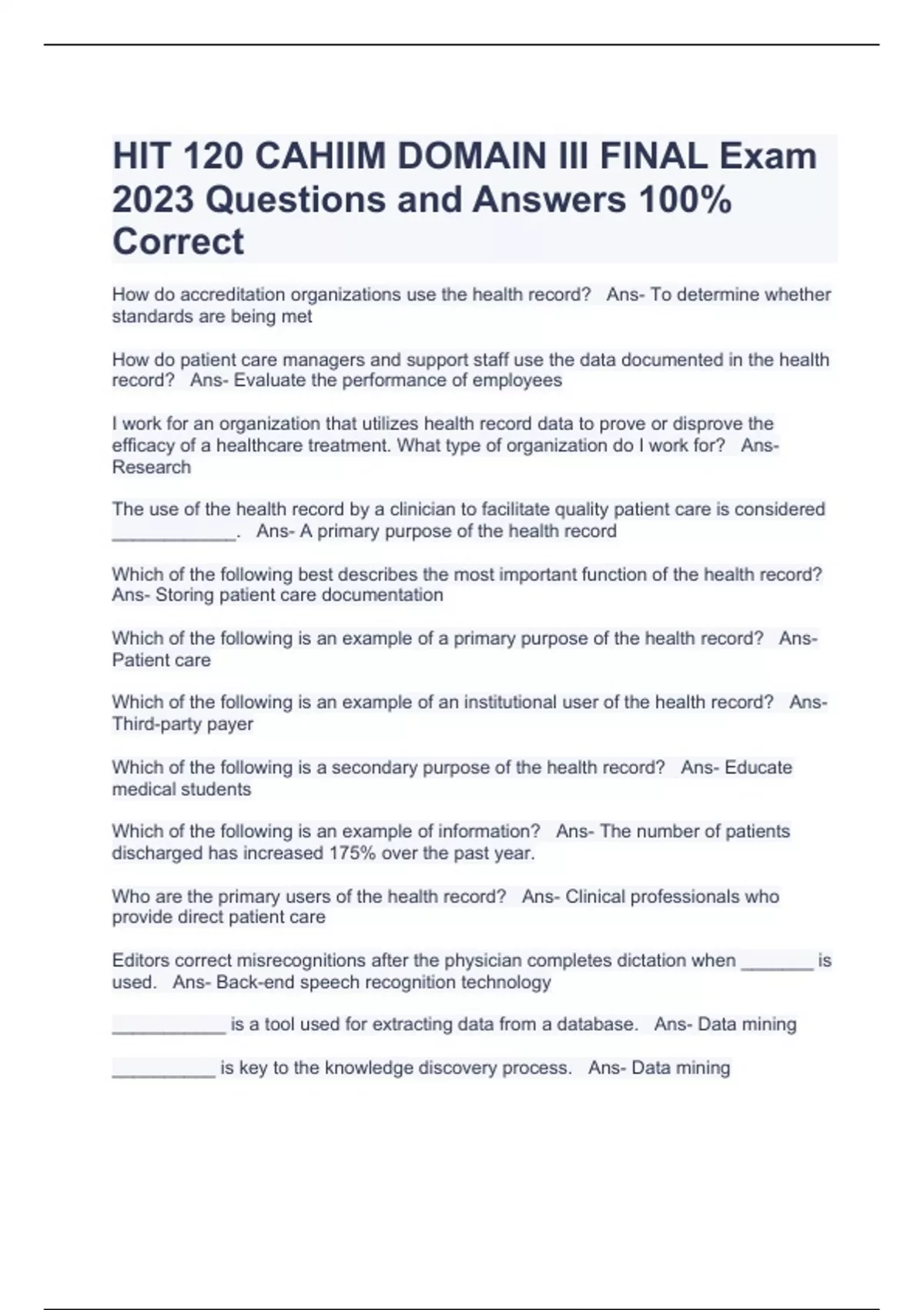 HIT 120 CAHIIM DOMAIN III FINAL Exam 2023 Questions and Answers 100% Correct