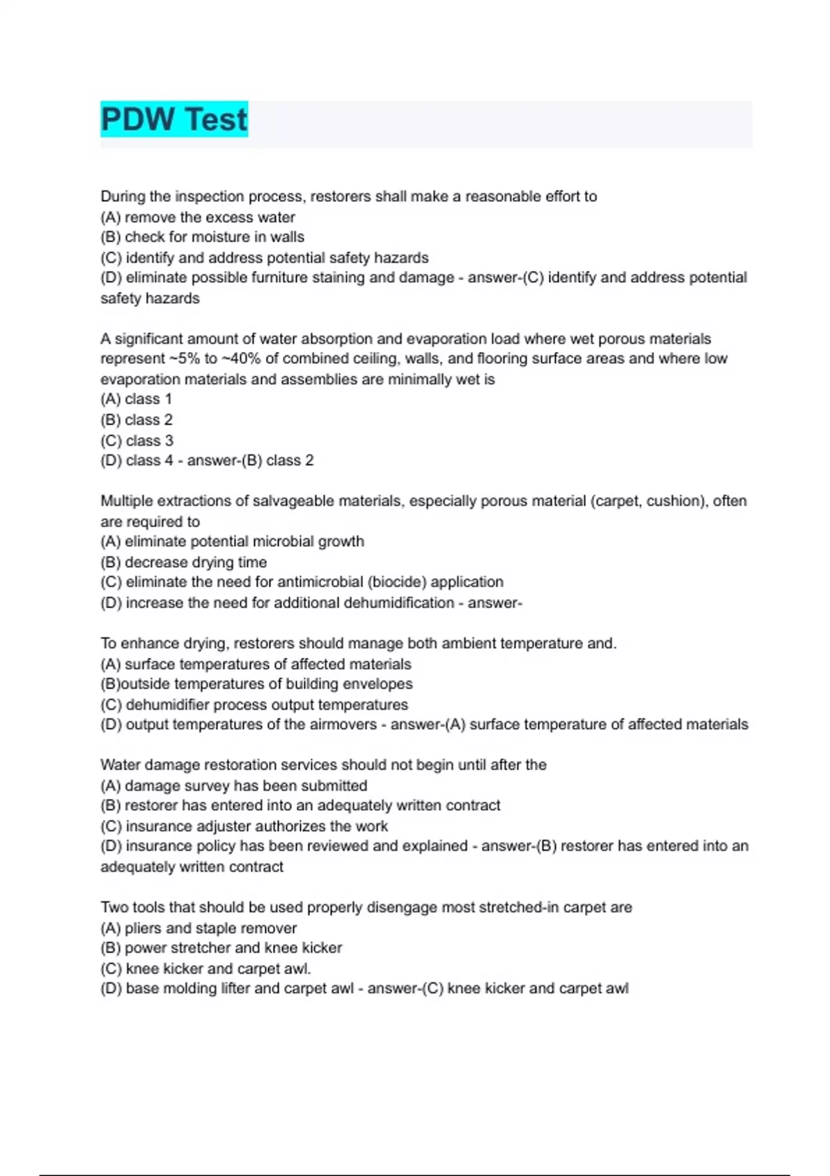 IICRC WRT Test 2023/2024 Solved 100% correct answers During the inspection process, restorers shall make a reasonable effort to (A) remove the excess water (B) check for moisture in walls (C) identify and address potential safety hazards (D) eliminate possible furniture staining and damage - answer-(C) identify and address potential safety hazards A significant amount of water absorption and evaporation load where wet porous materials represent ~5% to ~40% of combined ceiling, walls, and flooring surface areas and where low evaporation materials and assemblies are minimally wet is (A) class 1 (B) class 2 (C) class 3 (D) class 4 - answer-(B) class 2