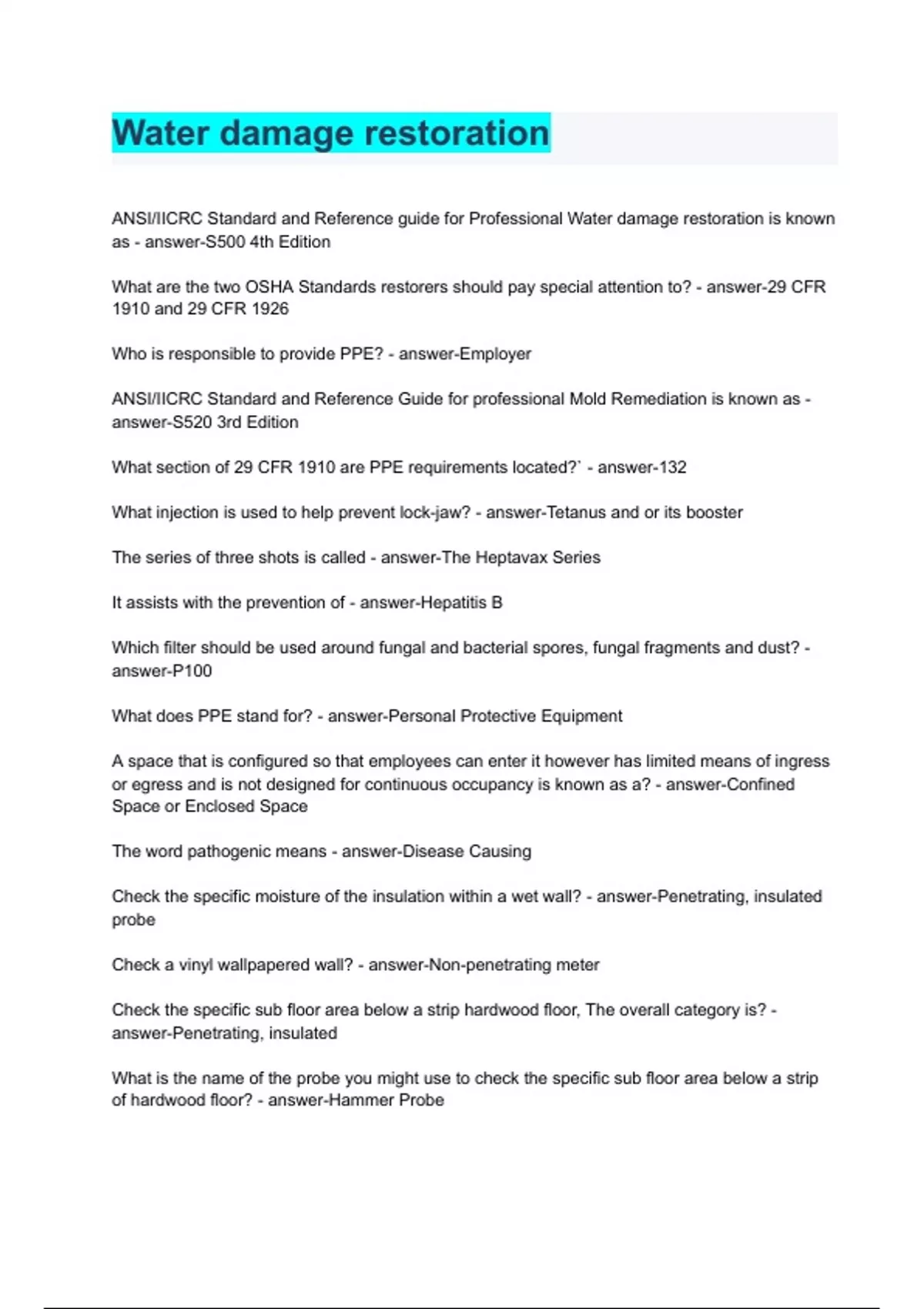 IICRC Water Restoration TANSI/IICRC Standard and Reference guide for Professional Water damage restoration is known as - answer-S500 4th Edition What are the two OSHA Standards restorers should pay special attention to? - answer-29 CFR 1910 and 29 CFR 1926 Who is responsible to provide PPE? - answer-Employer ANSI/IICRC Standard and Reference Guide for professional Mold Remediation is known as - answer-S520 3rd Edition What section of 29 CFR 1910 are PPE requirements located?` - answer-132 What injection is used to help prevent lock-jaw? - answer-Tetanus and or its booster The series of three shots is called - answer-The Heptavax Series It assists with the prevention of - answer-Hepatitis B echnician Exam 2023/2024 Answered 100%