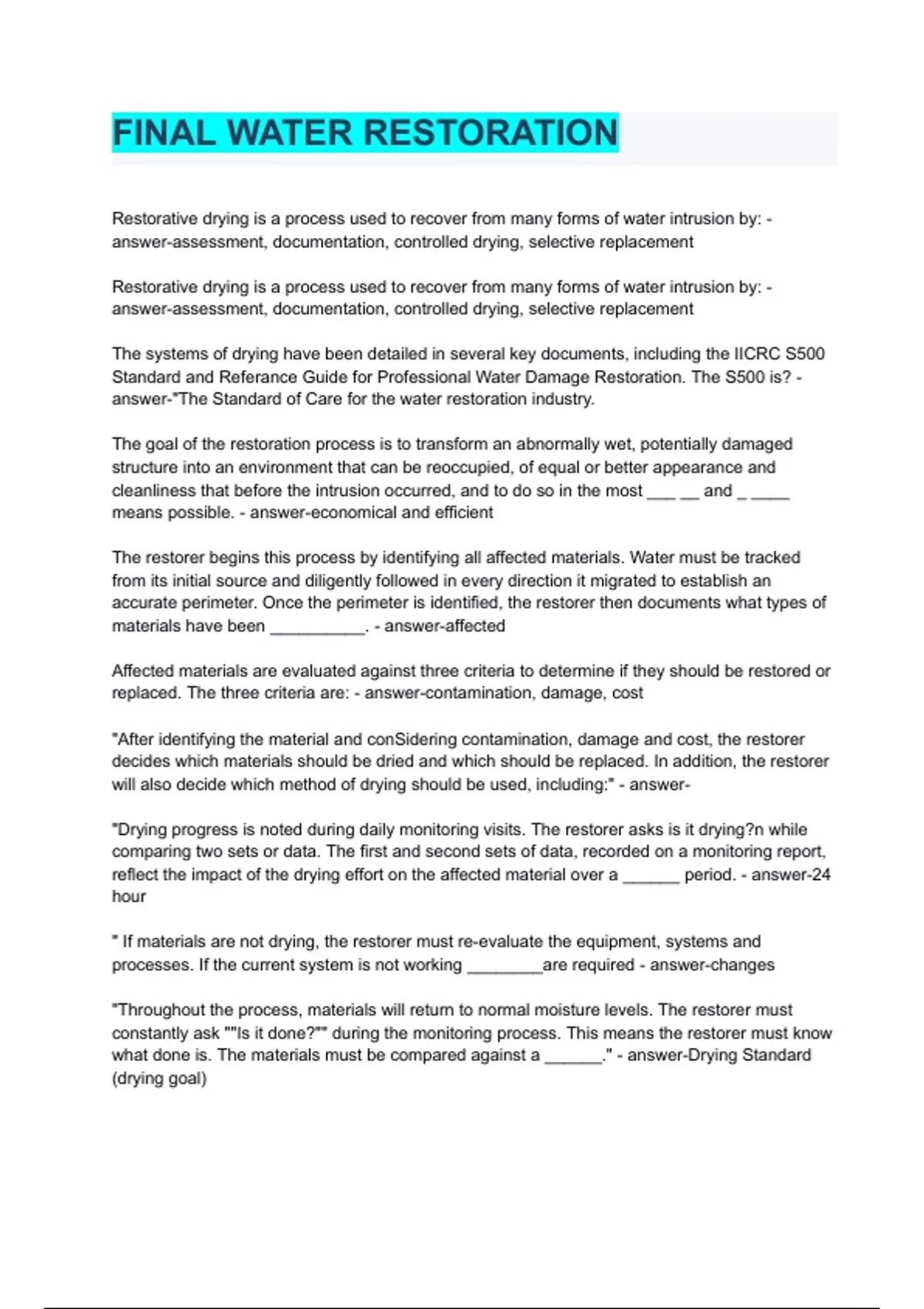 WATER RESTORATION Final Exam Graded A+ 2023/2024 full solution Restorative drying is a process used to recover from many forms of water intrusion by: - answer-assessment, documentation, controlled drying, selective replacement Restorative drying is a process used to recover from many forms of water intrusion by: - answer-assessment, documentation, controlled drying, selective replacement The systems of drying have been detailed in several key documents, including the IICRC S500 Standard and Referance Guide for Professional Water Damage Restoration. The S500 is? - answer-"The Standard of Care for the water restoration industry.