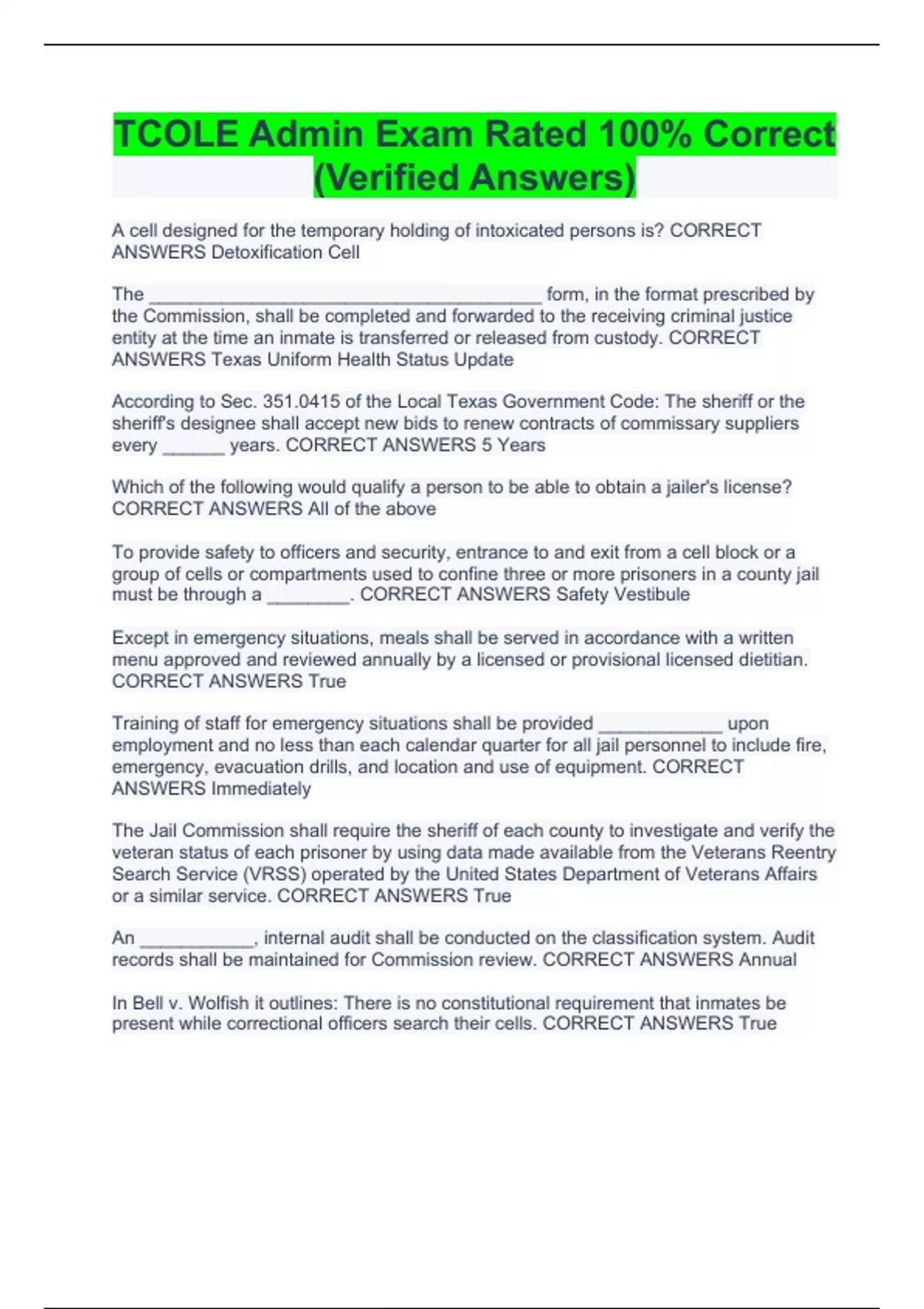 The commission shall adopt rules requiring a person, other than a sheriff, assigned to the jail administrator position overseeing a county jail to pass the examination not later than the _____ day after the date the person is assigned to that position. CORRECT ANSWERS 180th