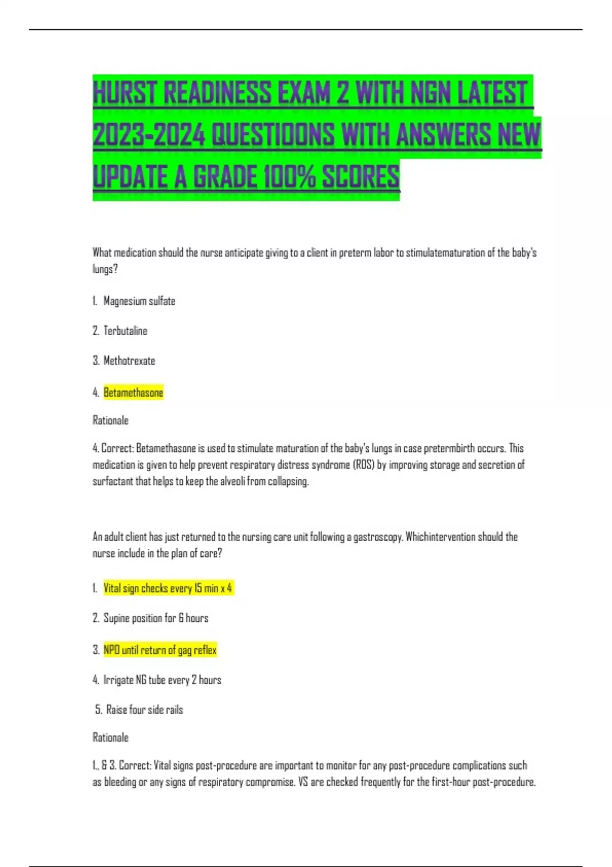 HURST READINESS EXAM 2 WITH NGN LATEST QUESTIOONS WITH ANSWERS NEW UPDATE A GRADE 100% SCORES What medication should the nurse anticipate giving to a client in preterm labor to stimulate maturation of the baby's lungs? 1. Magnesium sulfate 2. Terbutaline 3. Methotrexate 4. Betamethasone Rationale 4. Correct: Betamethasone is used to stimulate maturation of the baby's lungs in case preterm birth occurs. This medication is given to help prevent respiratory distress syndrome (RDS) by improving storage and secretion of surfactant that helps to keep the alveoli from collapsing. An adult client has just returned to the nursing care unit following a gastroscopy. Which intervention should the nurse include in the plan of care? 1. Vital sign checks every 15 min x 4 2. Supine position for 6 hours 3. NPO until return of gag reflex 4. Irrigate NG tube every 2 hours 5. Raise four side rails Rationale 1., & 3. Correct: Vital signs post-procedure are important to monitor for any post-procedure complications such as bleeding or any signs of respiratory compromise. VS are checked frequently for the first-hour post-procedure. Any client who has a scope inserted down the throat and has received numbing medication in the back of the throat to depress the gag reflex should be kept NPO until the gag reflex returns. A 70-year-old client was admitted to the vascular surgery unit during the night shift with chronic hypertension. At 0830, the unlicensed nursing assistant (UAP) reports that the client's BP is