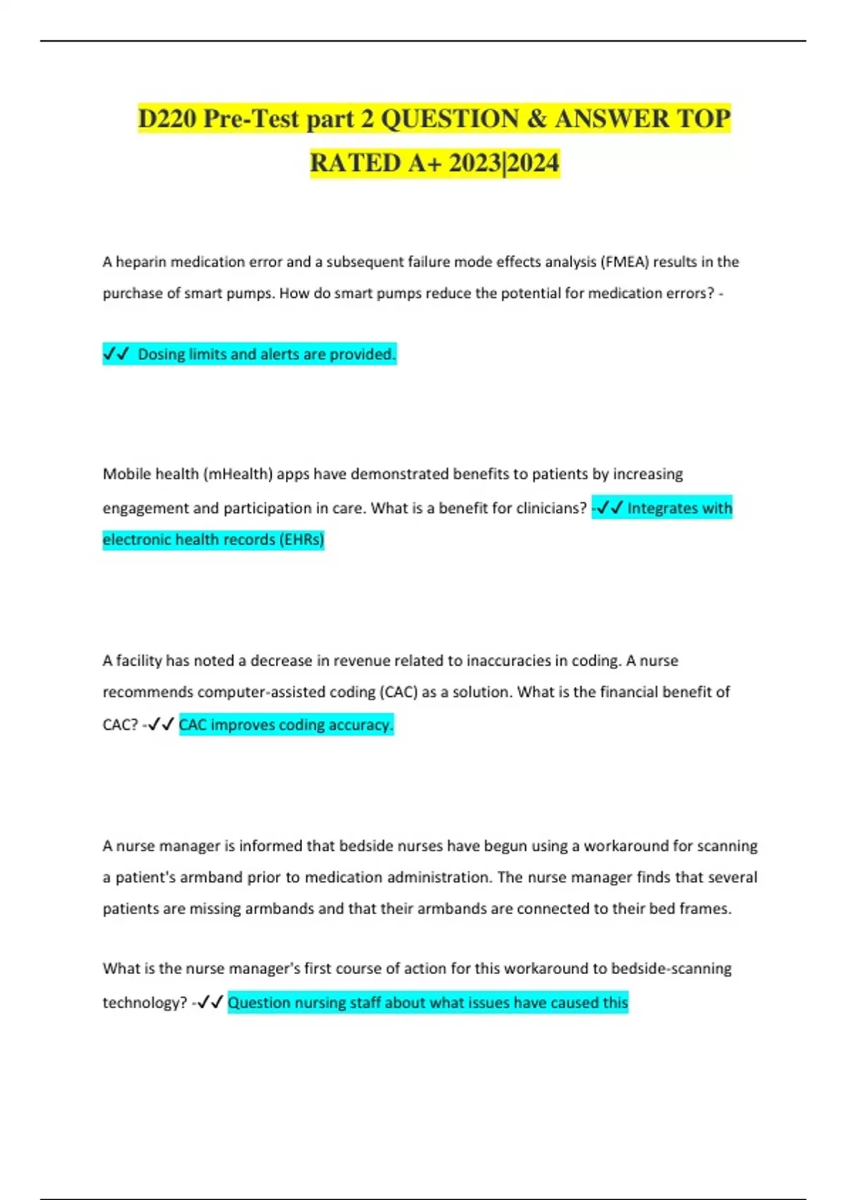 D220 Pre-Test part 2 QUESTION & ANSWER TOP RATED A+ 2023|2024 A heparin medication error and a subsequent failure mode effects analysis (FMEA) results in the purchase of smart pumps. How do smart pumps reduce the potential for medication errors? - Dosing limits and alerts are provided. Mobile health (mHealth) apps have demonstrated benefits to patients by increasing engagement and participation in care. What is a benefit for clinicians? - Integrates with electronic health records (EHRs) A facility has noted a decrease in revenue related to inaccuracies in coding. A nurse recommends computer-assisted coding (CAC) as a solution. What is the financial benefit of CAC? - CAC improves coding accuracy. A nurse manager is informed that bedside nurses have begun using a workaround for scanning a patient's armband prior to medication administration. The nurse manager finds that several patients are missing armbands and that their armbands are connected to their bed frames. What is the nurse manager's first course of action for this workaround to bedside-scanning technology? - Question nursing staff about what issues have caused this