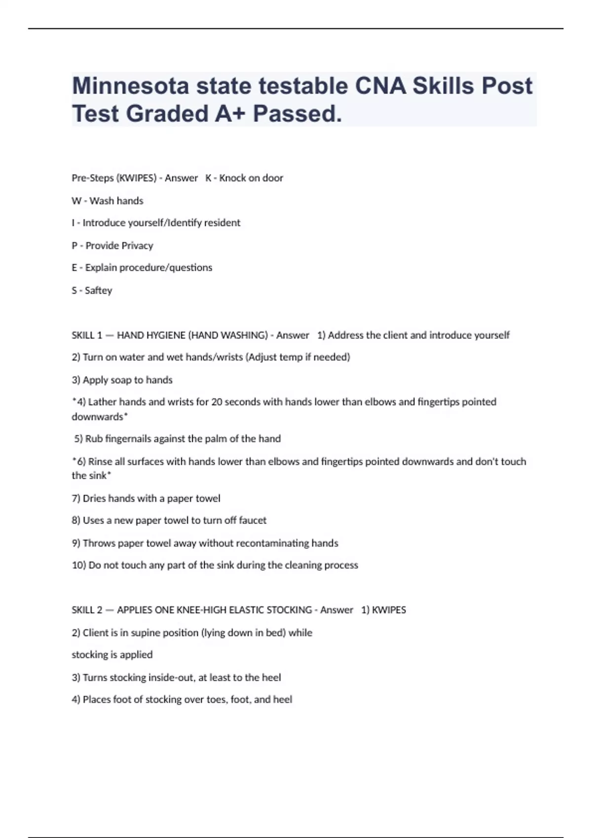 Pre-Steps (KWIPES) - Answer K - Knock on door W - Wash hands I - Introduce yourself/Identify resident P - Provide Privacy E - Explain procedure/questions S - Saftey SKILL 1 — HAND HYGIENE (HAND WASHING) - Answer 1) Address the client and introduce yourself 2) Turn on water and wet hands/wrists (Adjust temp if needed) 3) Apply soap to hands *4) Lather hands and wrists for 20 seconds with hands lower than elbows and fingertips pointed downwards* 5) Rub fingernails against the palm of the hand *6) Rinse all surfaces with hands lower than elbows and fingertips pointed downwards and don't touch the sink* 7) Dries hands with a paper towel 8) Uses a new paper towel to turn off faucet 9) Throws paper towel away without recontaminating hands 10) Do not touch any part of the sink during the cleaning process SKILL 2 — APPLIES ONE KNEE-HIGH ELASTIC STOCKING - Answer 1) KWIPES 2) Client is in supine position (lying down in bed) while stocking is applied 3) Turns stocking inside-out, at least to the heel 4) Places foot of stocking over toes, foot, and heel