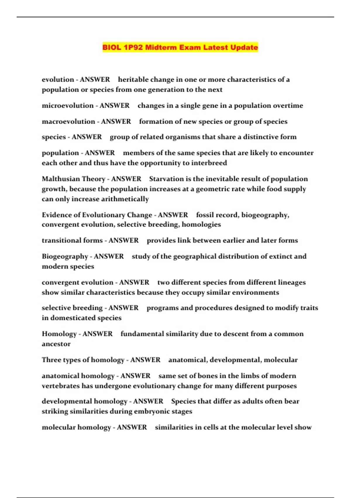 BIOL 1P92 Midterm Exam Latest Update...